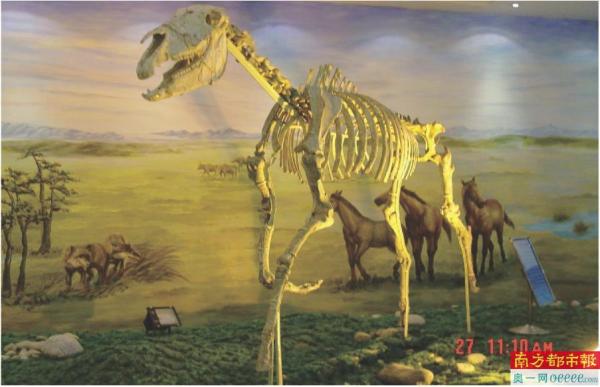 除了安琪马,和政还生活过1200万年的三趾马。展览还展示了三趾马的完整骨架化石。慈海燕介绍说,和政三趾马的脚趾结构因每个马蹄有三个脚趾而得名,证明当时有少许沼泽地,为了不陷到沼泽地里,起到分力支撑的作用。在和政地区生活过的三趾马种类有5种之多。展柜中您看到的是贾氏三趾马、腔脊三趾马、渭河三趾马等化石。
