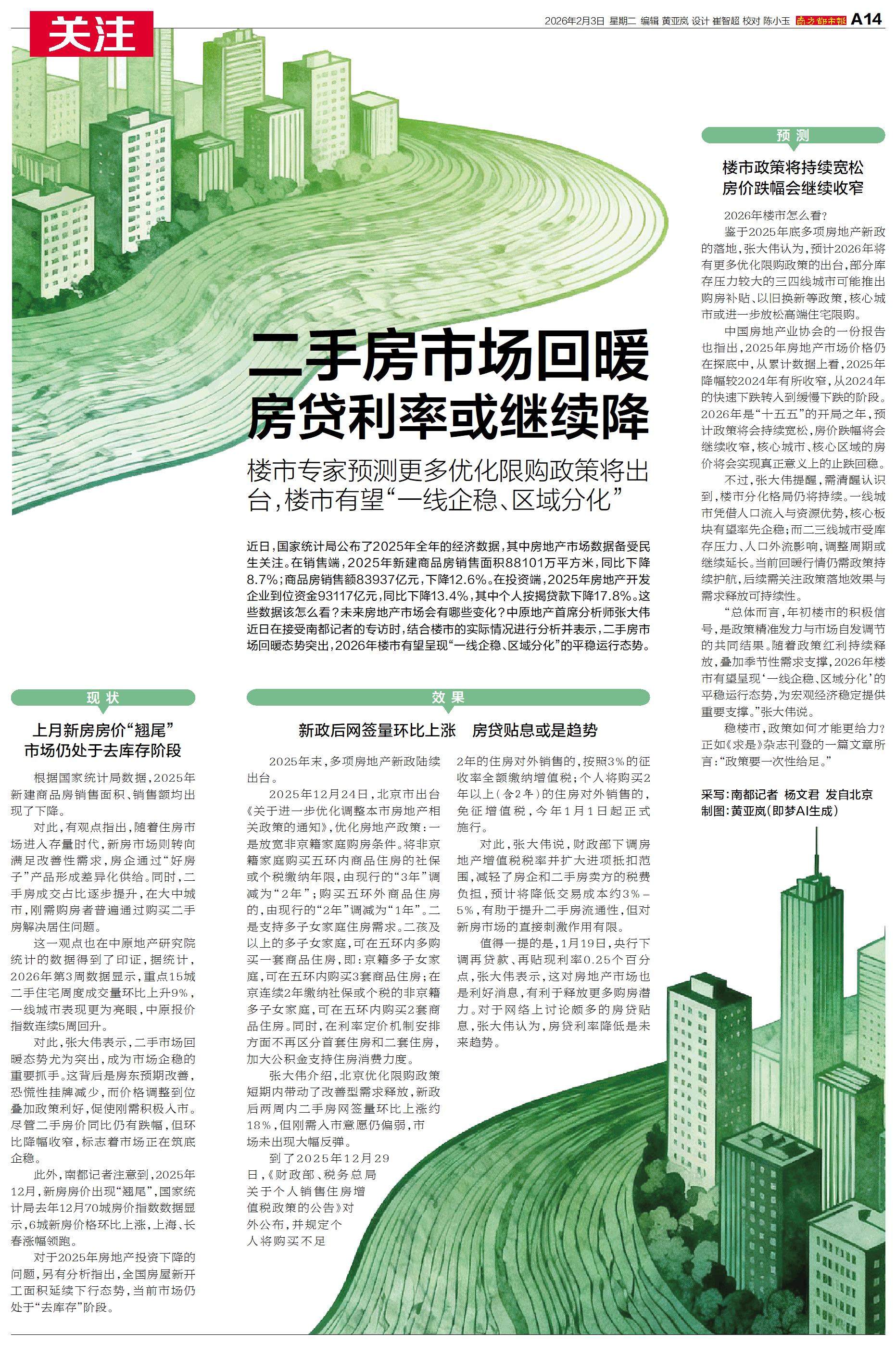 “总体而言,年初楼市的积极信号,是政策精准发力与市场自发调节的共同结果。随着政策红利持续释放,叠加季节性需求支撑,2026年楼市有望呈现‘一线企稳、区域分化’的平稳运行态势,为宏观经济稳定提供重要支撑。”张大伟说。