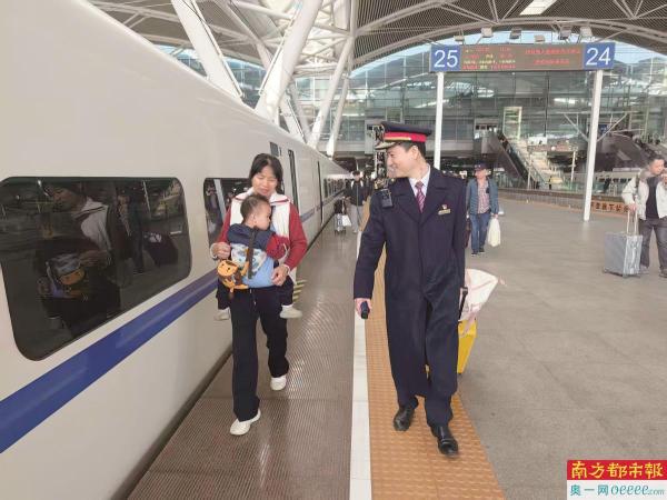 1. 2月3日,广州南站,一旅客带着孩子在站台和工作人员并肩而行。