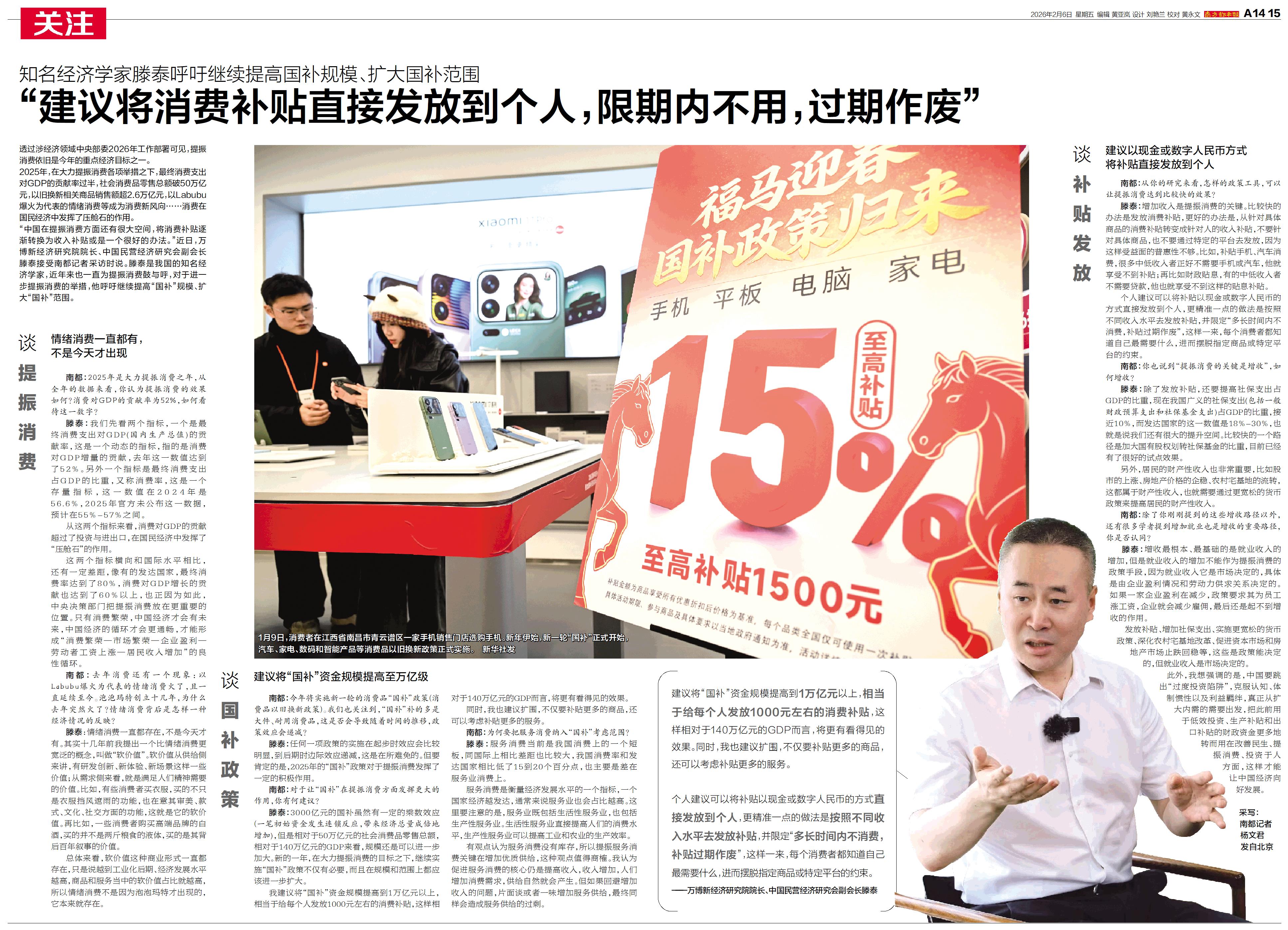 “建议将消费补贴直接发放到个人,限期内不用,过期作废”