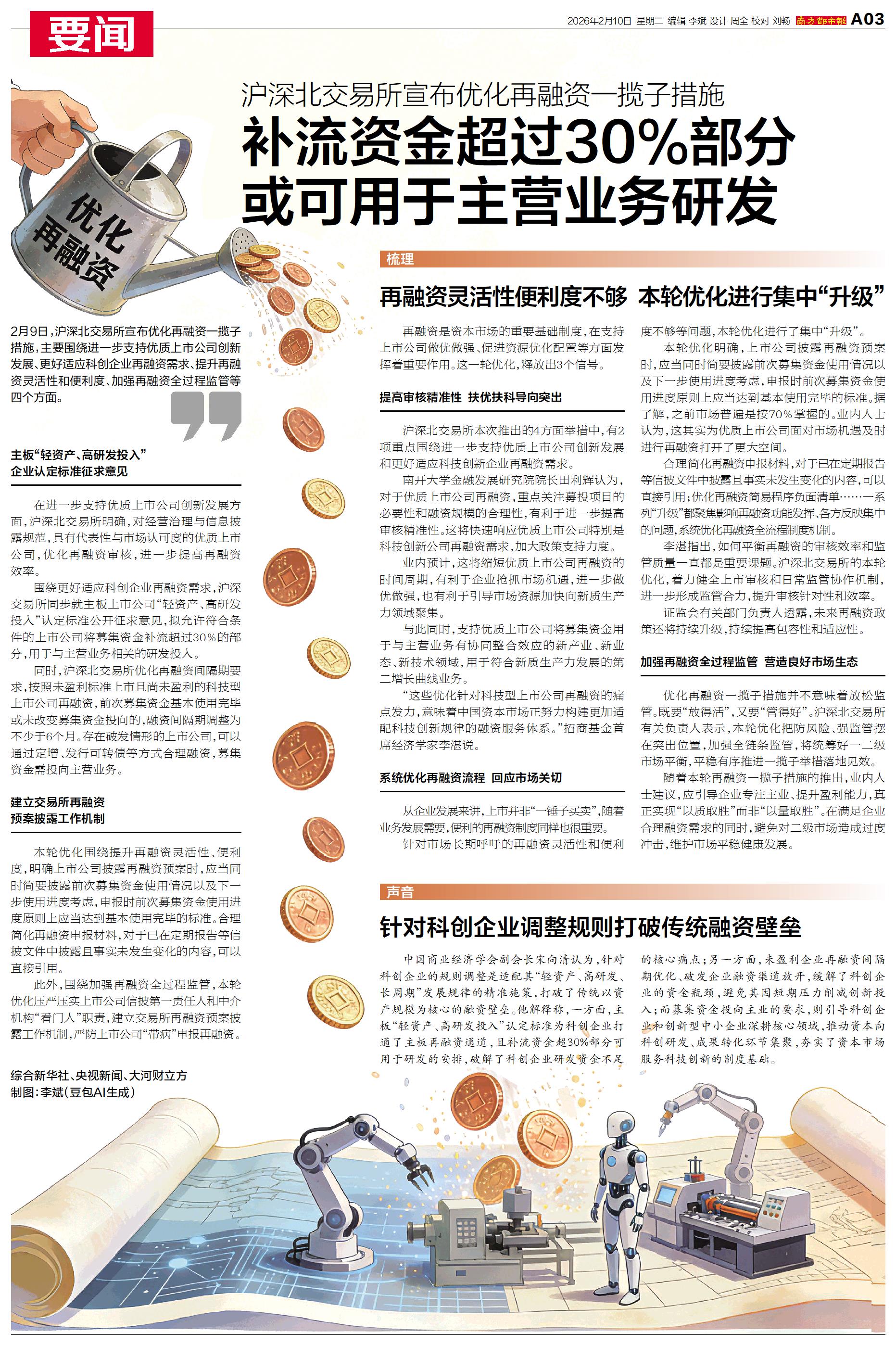 2月9日,沪深北交易所宣布优化再融资一揽子措施,主要围绕进一步支持优质上市公司创新发展、更好适应科创企业再融资需求、提升再融资灵活性和便利度、加强再融资全过程监管等四个方面。
