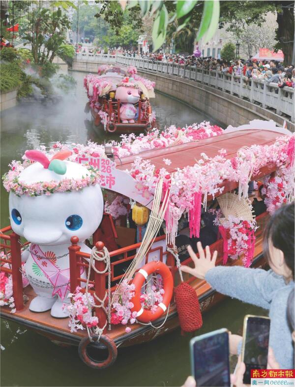 昨日,“喜洋洋”和“乐融融”在荔枝湾涌的花墟上,坐花船赏西关花市美景。2月12日至14日,2026年广州水上花市在西关永庆坊旅游区举办。今年花市重回荔枝湾,并将活动地从荔湾湖扩大至荔枝湾涌沿线、粤剧博物馆片区、永庆坊片区。 南都记者 黎湛均 摄