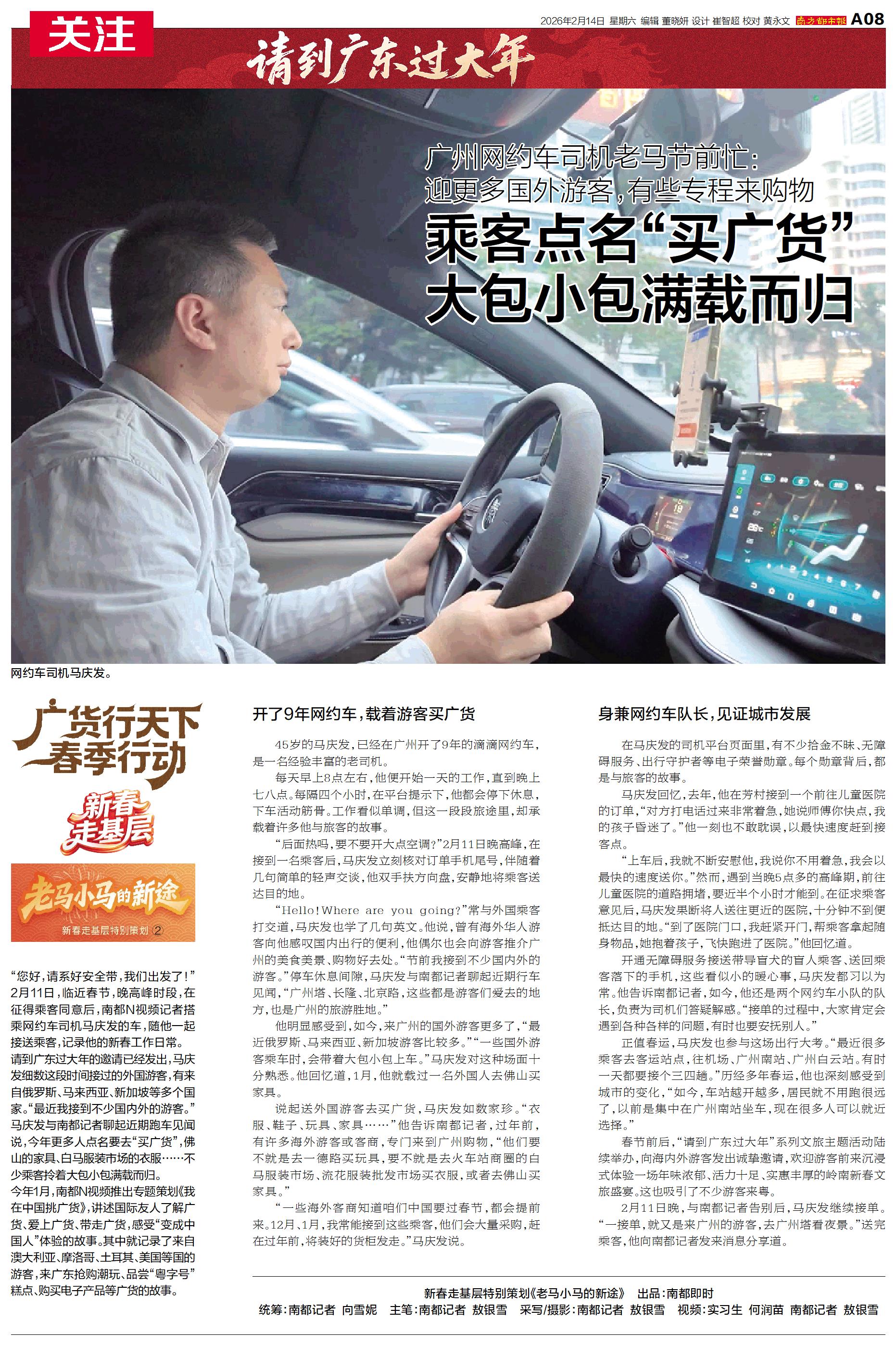 “您好,请系好安全带,我们出发了!”2月11日,临近春节,晚高峰时段,在征得乘客同意后,南都N视频记者搭乘网约车司机马庆发的车,随他一起接送乘客,记录他的新春工作日常。
