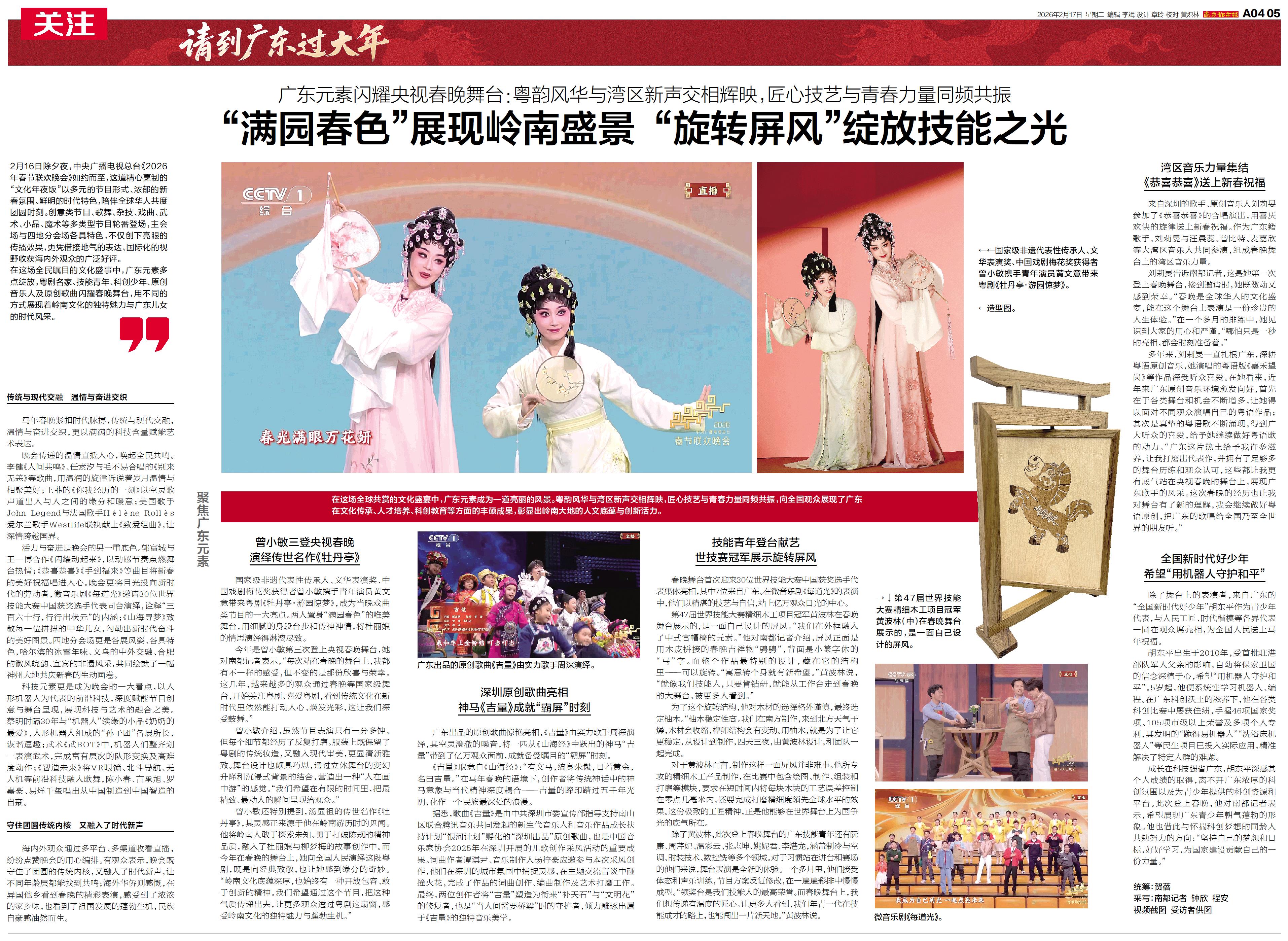 在这场全民瞩目的文化盛事中,广东元素多点绽放,粤剧名家、技能青年、科创少年、原创音乐人及原创歌曲闪耀春晚舞台,用不同的方式展现着岭南文化的独特魅力与广东儿女的时代风采。