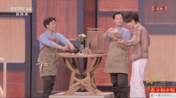 第47届世界技能大赛精细木工项目冠军黄波林(中)在春晚舞台展示的,是一面自己设计的屏风。