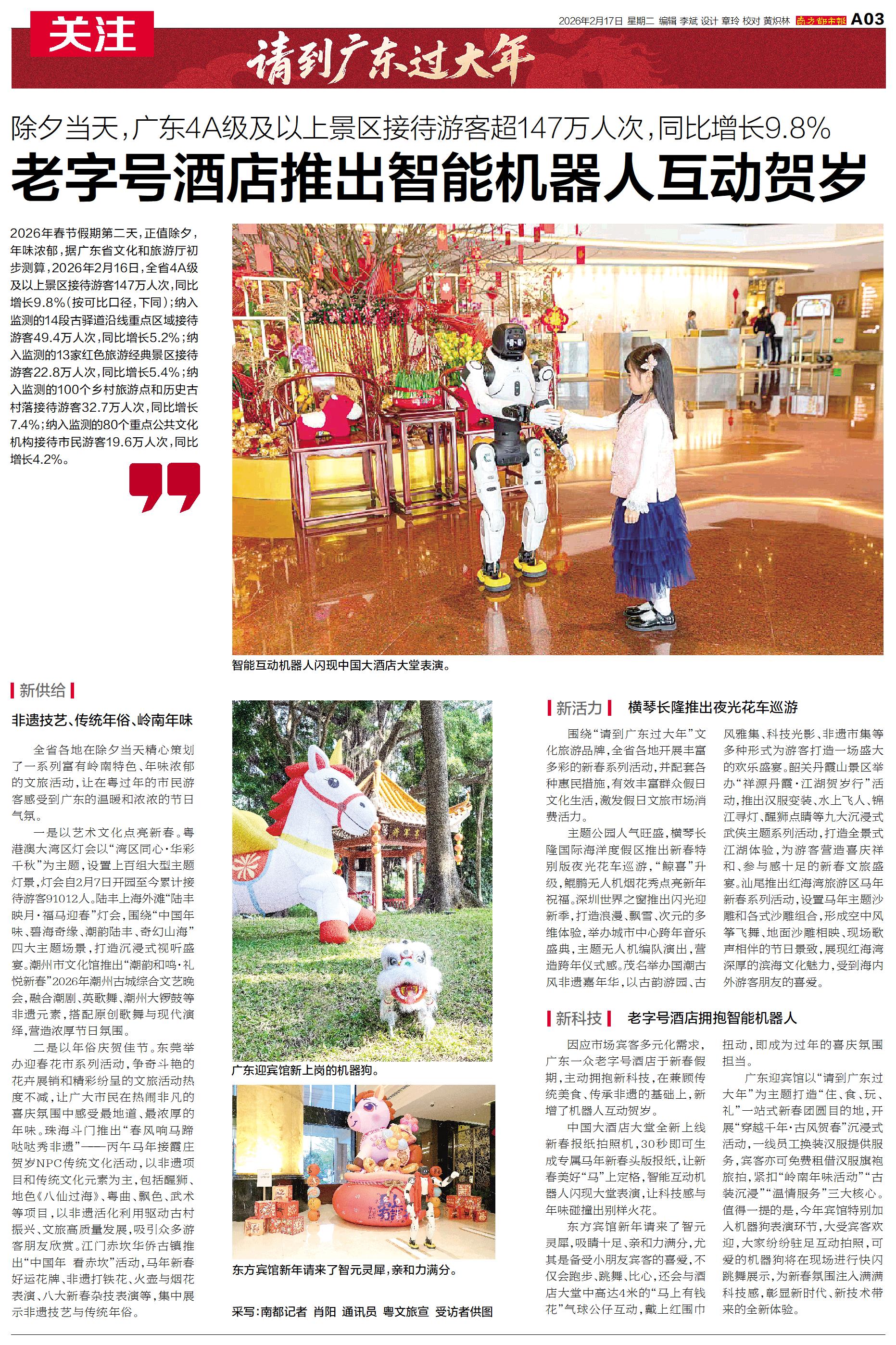 据广东省文化和旅游厅初步测算,2026年2月16日,全省4A级及以上景区接待游客147万人次,同比增长9.8%。