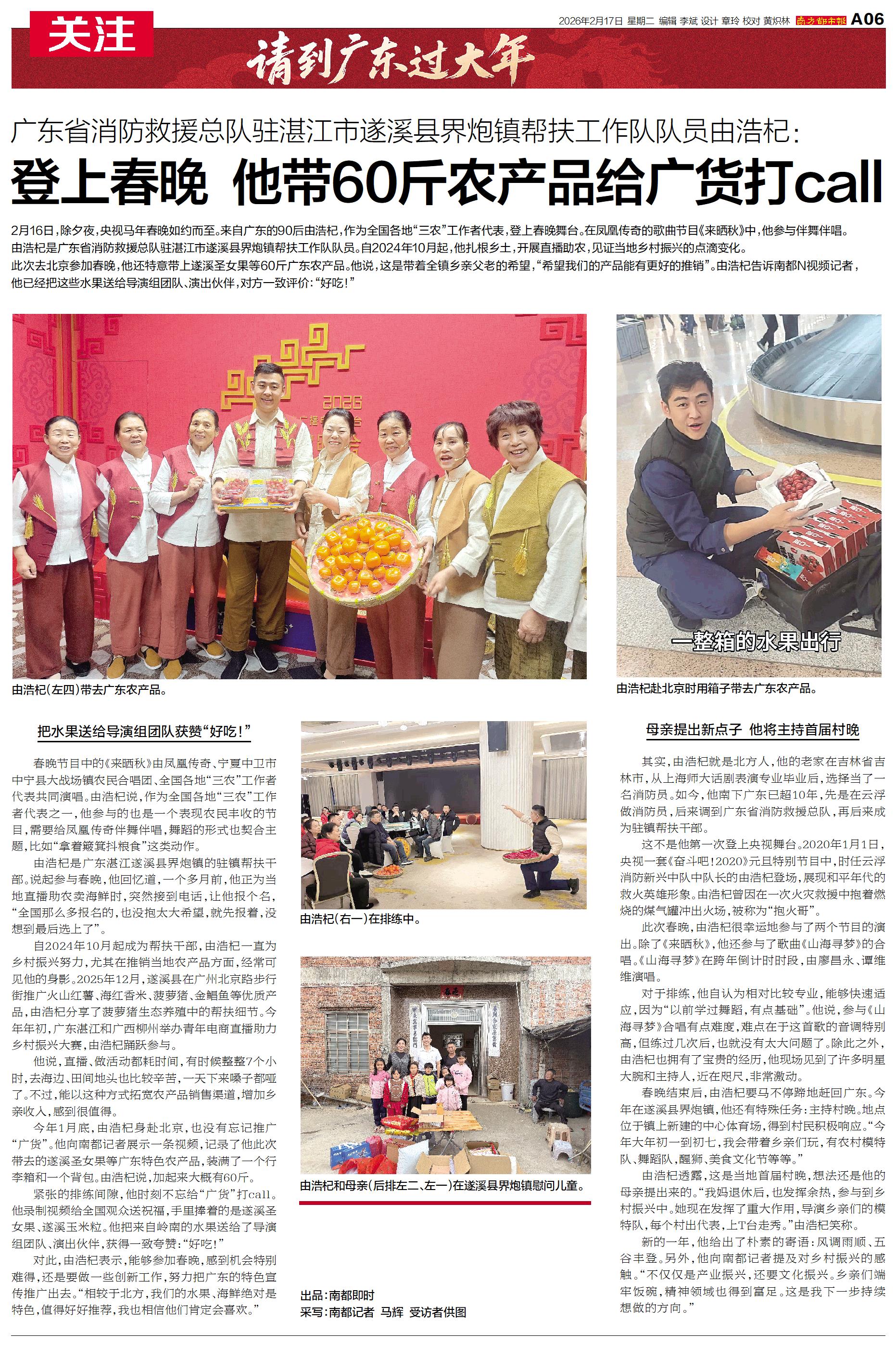 2月16日,除夕夜,央视马年春晚如约而至。来自广东的90后由浩杞,作为全国各地“三农”工作者代表,登上春晚舞台。在凤凰传奇的歌曲节目《来晒秋》中,他参与伴舞伴唱。