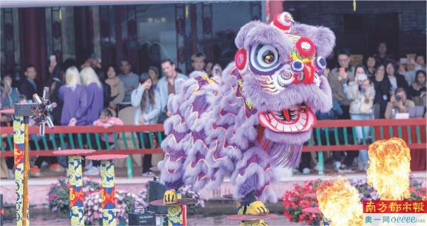 宝墨园里的特色节目《雄狮高桩闯烈焰》。