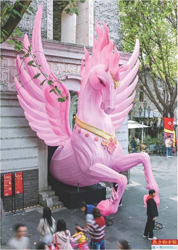 岭南新天地携手佛山民间艺术研究社,融合多元文化视角与当代艺术表达,共同创作了大型新春彩灯装置《奇骥盈门》。作品灵感来源于东西方文化中“马”的精神意象——既融合希腊飞马所象征的勇气与力量,亦汲取敦煌天马蕴含的远行与超越之境。经由佛山非遗彩灯工艺精琢而成,“奇骥”展翼踏福,流光溢彩,生动诠释了“在地新生的文化可能性”。“奇骥”谐音“奇迹”,愿以此寄托人们对新一年的美好期盼。
