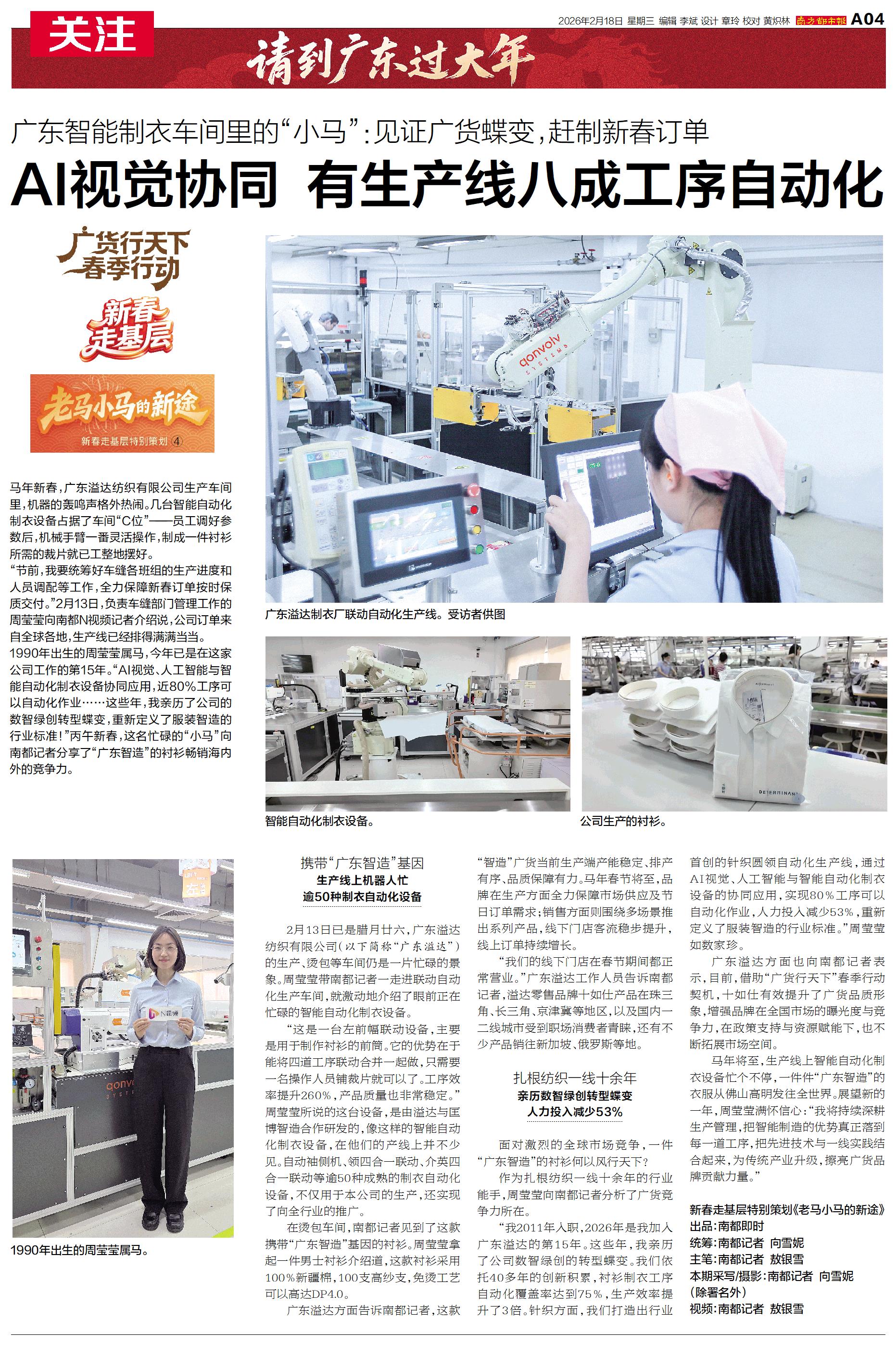 这些年,我亲历了公司的数智绿创转型蝶变,重新定义了服装智造的行业标准!”丙午新春,这名忙碌的“小马”向南都记者分享了“广东智造”的衬衫畅销海内外的竞争力。