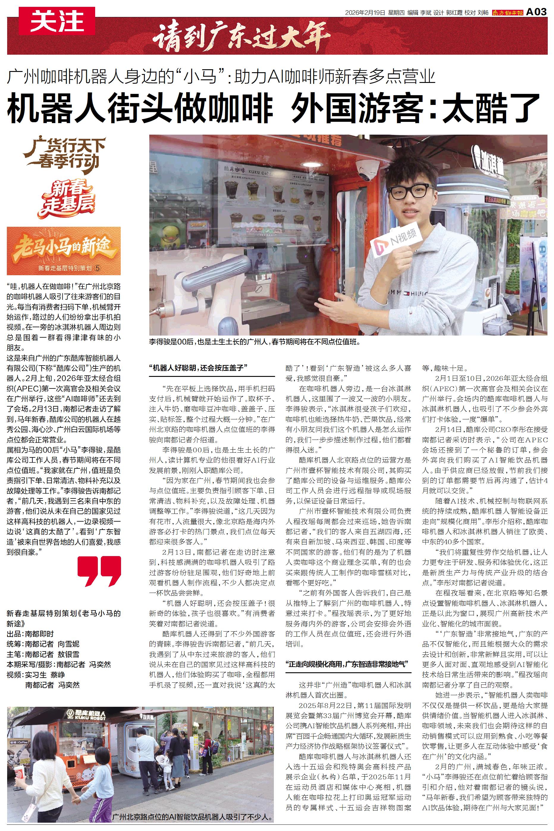 2月13日,南都记者走访了解到,马年新春,酷库公司的机器人在越秀公园、海心沙、广州白云国际机场等点位都会正常营业。