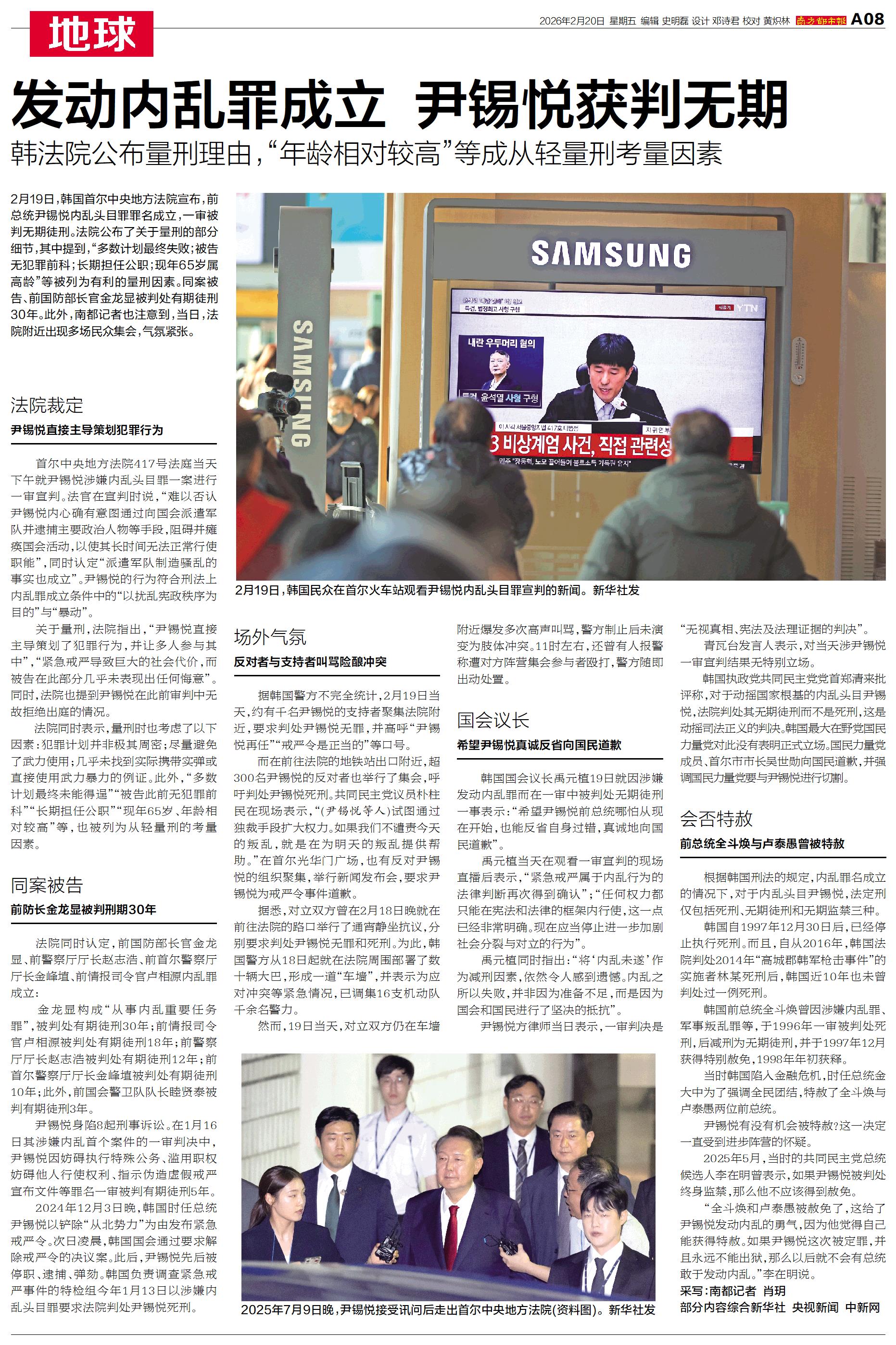 2月19日,韩国首尔中央地方法院宣布,前总统尹锡悦内乱头目罪罪名成立,一审被判无期徒刑。法院公布了关于量刑的部分细节,其中提到,“多数计划最终失败;被告无犯罪前科;长期担任公职;现年65岁属高龄”等被列为有利的量刑因素。同案被告、前国防部长官金龙显被判处有期徒刑30年。此外,南都记者也注意到,当日,法院附近出现多场民众集会,气氛紧张。