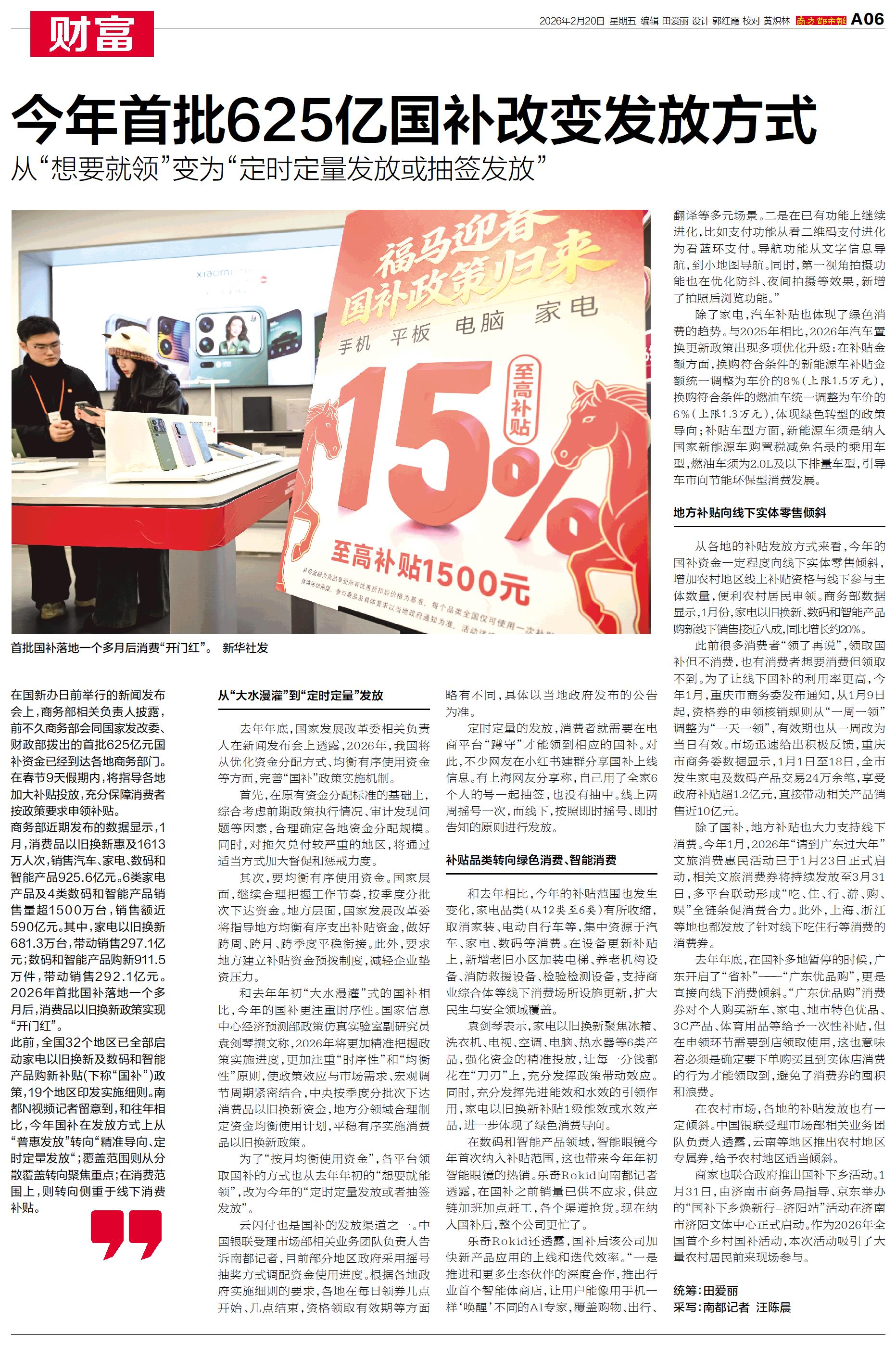 和去年年初“大水漫灌”式的国补相比,今年的国补更注重时序性。国家信息中心经济预测部政策仿真实验室副研究员袁剑琴撰文称,2026年将更加精准把握政策实施进度,更加注重“时序性”和“均衡性”原则,使政策效应与市场需求、宏观调节周期紧密结合,中央按季度分批次下达消费品以旧换新资金,地方分领域合理制定资金均衡使用计划,平稳有序实施消费品以旧换新政策。