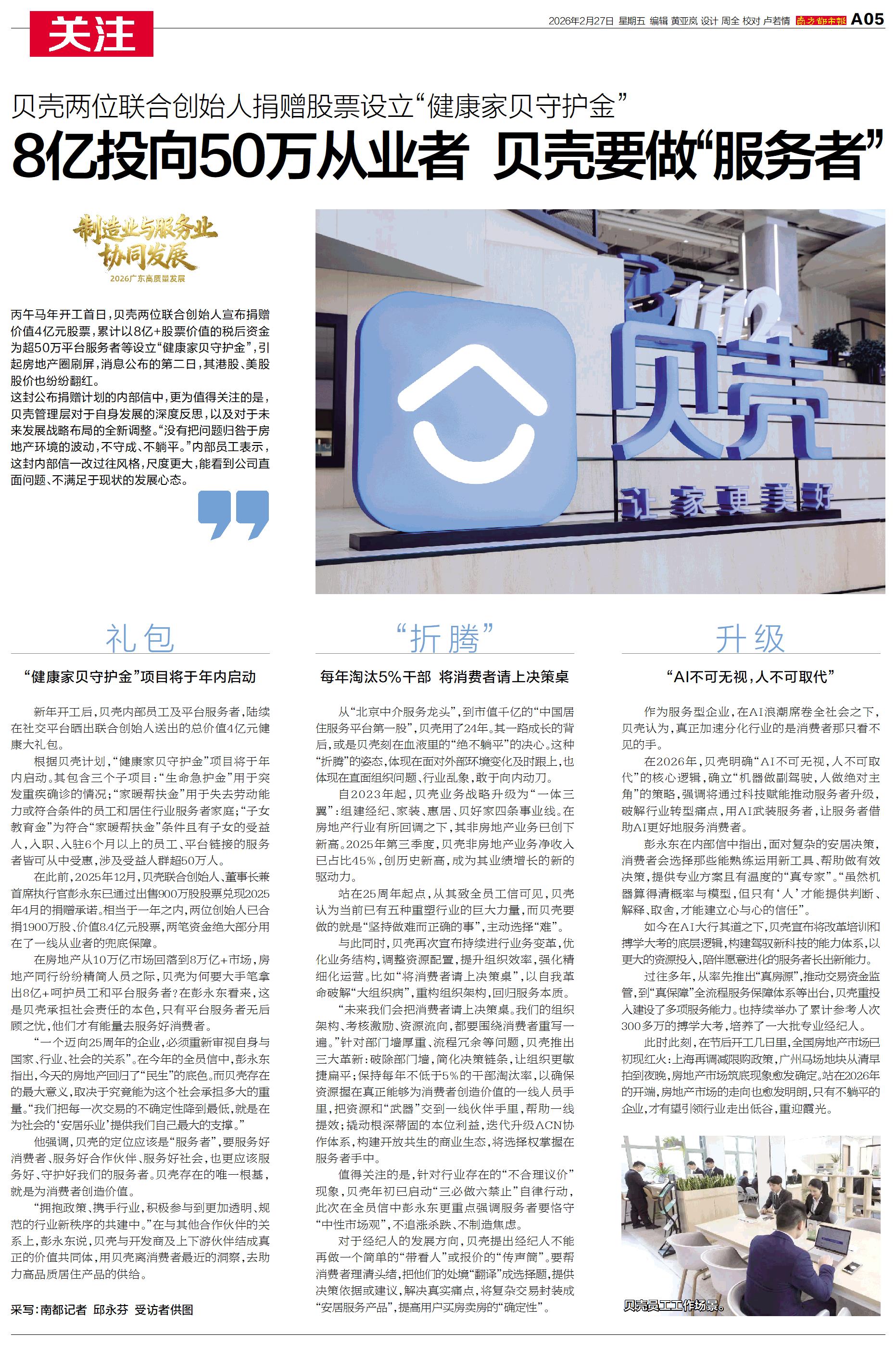 丙午马年开工首日,贝壳两位联合创始人宣布捐赠价值4亿元股票,累计以8亿+股票价值的税后资金为超50万平台服务者等设立“健康家贝守护金”,引起房地产圈刷屏。