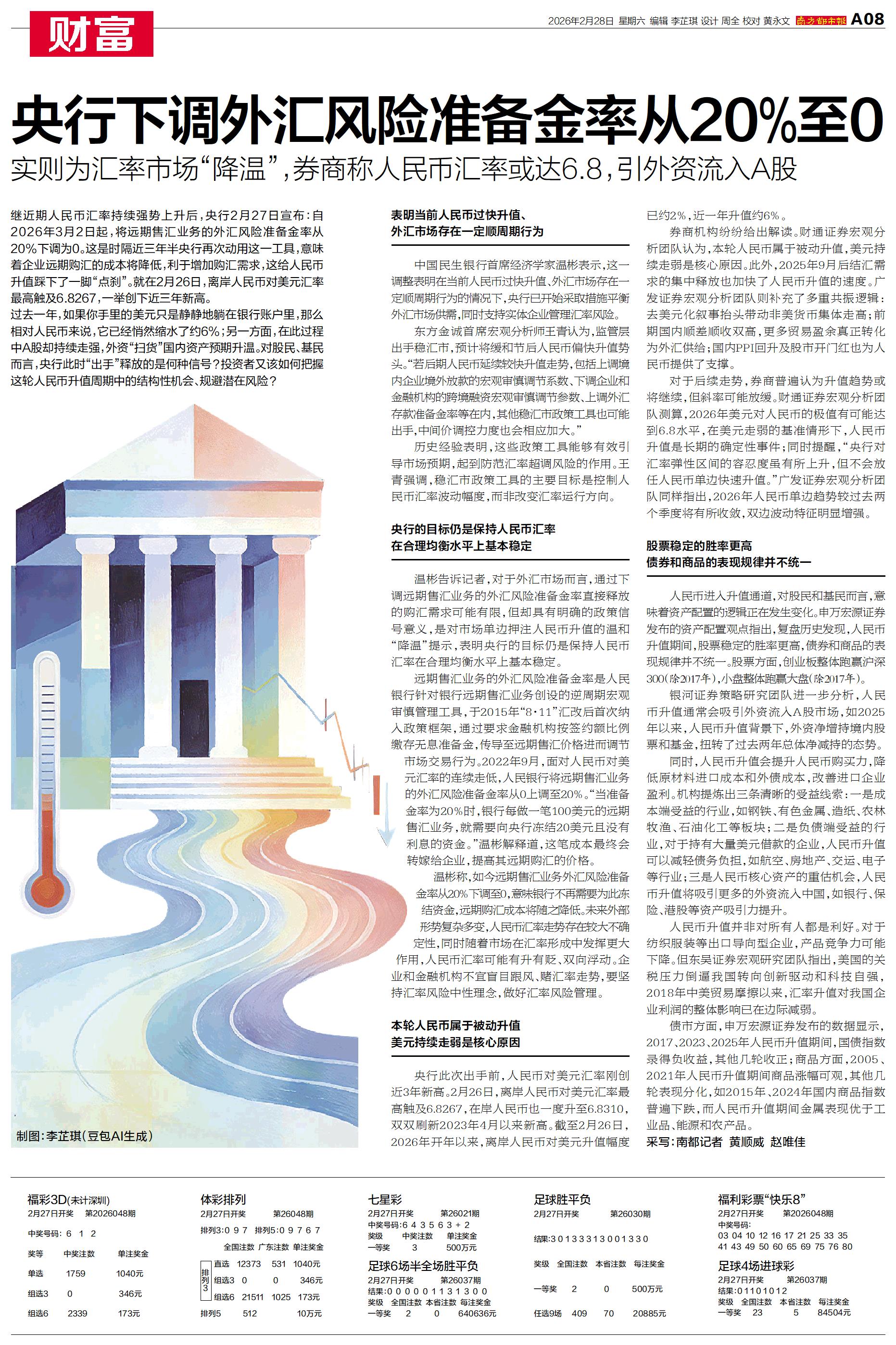 继近期人民币汇率持续强势上升后,央行2月27日宣布:自2026年3月2日起,将远期售汇业务的外汇风险准备金率从20%下调为0。
