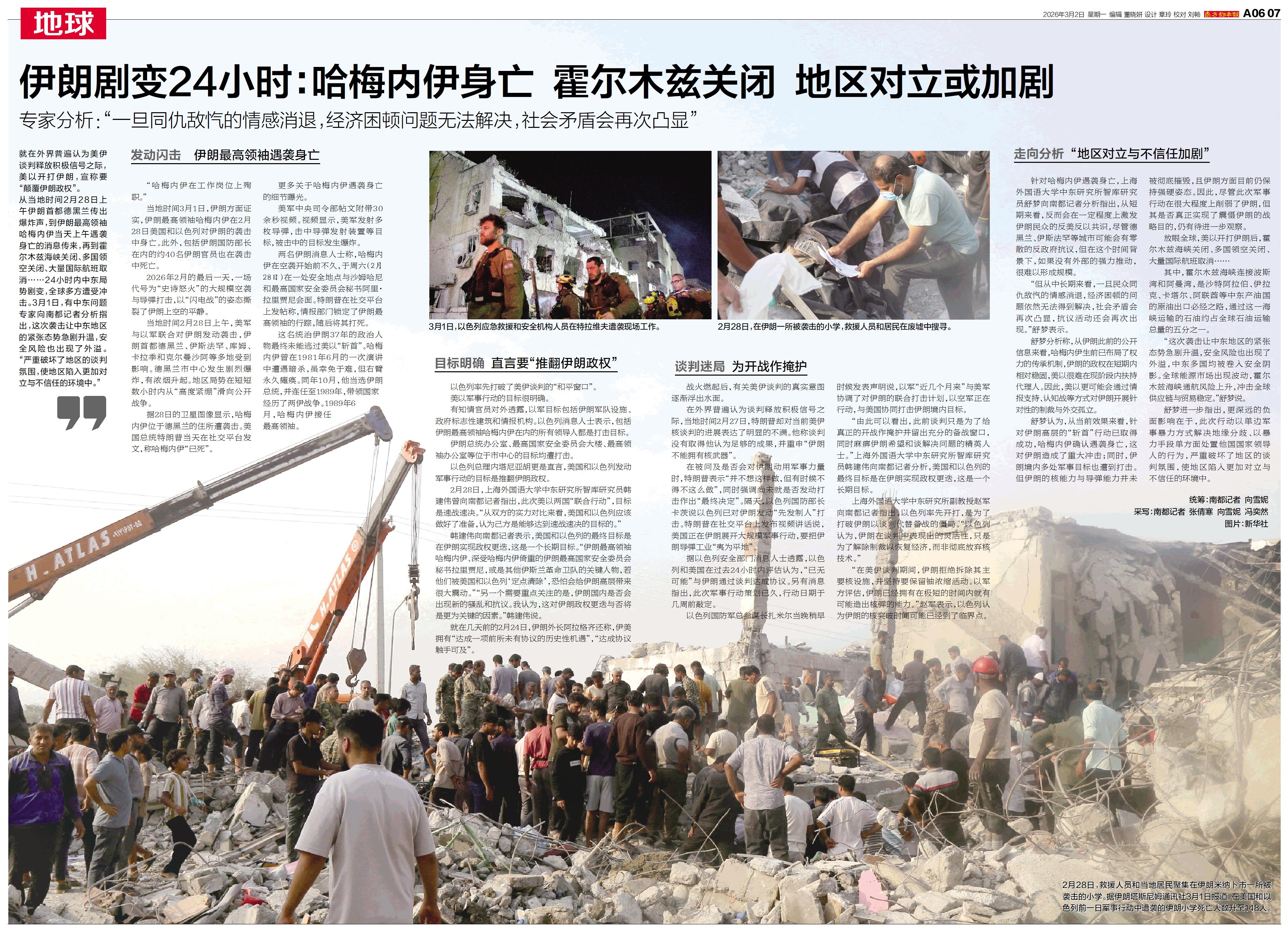 2月28日,在伊朗一所被袭击的小学,救援人员和居民在废墟中搜寻。