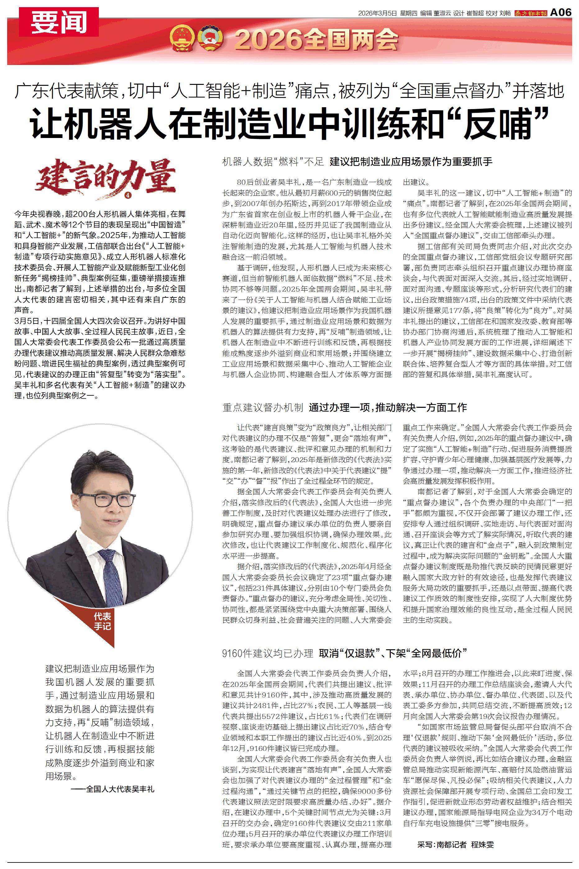 今年央视春晚,超200台人形机器人集体亮相,在舞蹈、武术、魔术等12个节目的表现呈现出“中国智造”和“人工智能+”的新气象。2025年,为推动人工智能和具身智能产业发展,工信部联合出台《“人工智能+制造”专项行动实施意见》、成立人形机器人标准化技术委员会、开展人工智能产业及赋能新型工业化创新任务“揭榜挂帅”、典型案例征集,重磅举措接连推出。南都记者了解到,上述举措的出台,与多位全国人大代表的建言密切相关,其中还有来自广东的声音。