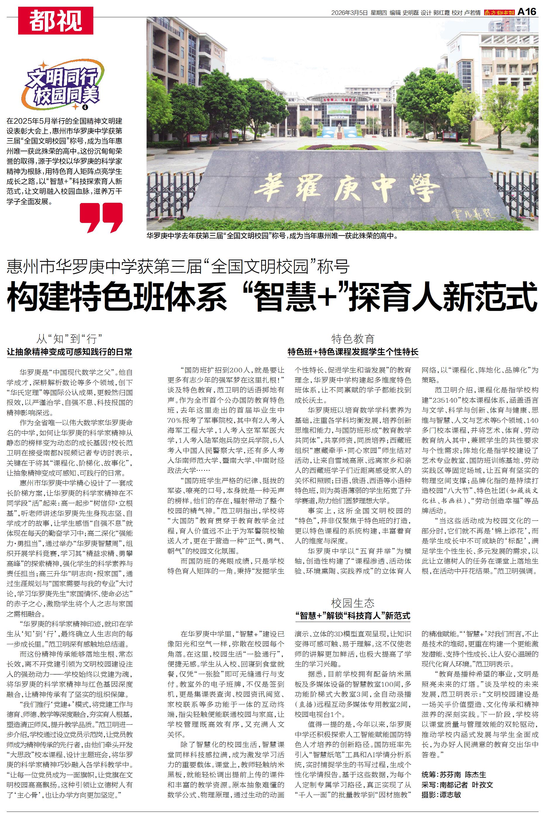 在2025年5月举行的全国精神文明建设表彰大会上,惠州市华罗庚中学获第三届“全国文明校园”称号,成为当年惠州唯一获此殊荣的高中。