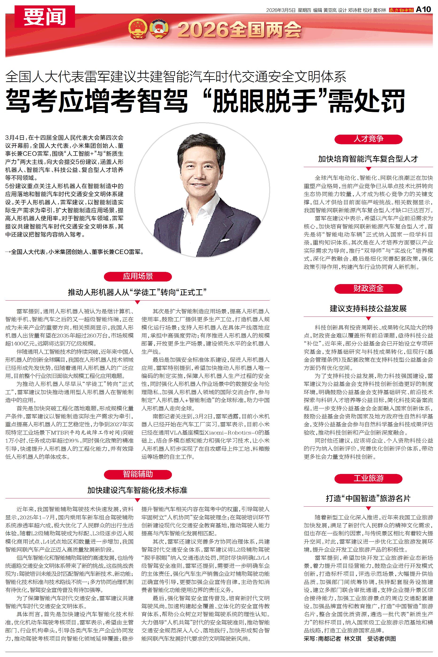 3月4日,在十四届全国人民代表大会第四次会议开幕前,全国人大代表,小米集团创始人、董事长兼CEO雷军,围绕“人工智能+”与“新质生产力”两大主线,向大会提交5份建议,涵盖人形机器人、智能汽车、科技公益