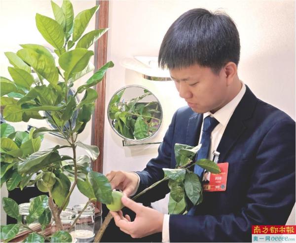 两会期间,廖志略将一株结果的化橘红苗带到北京参会。