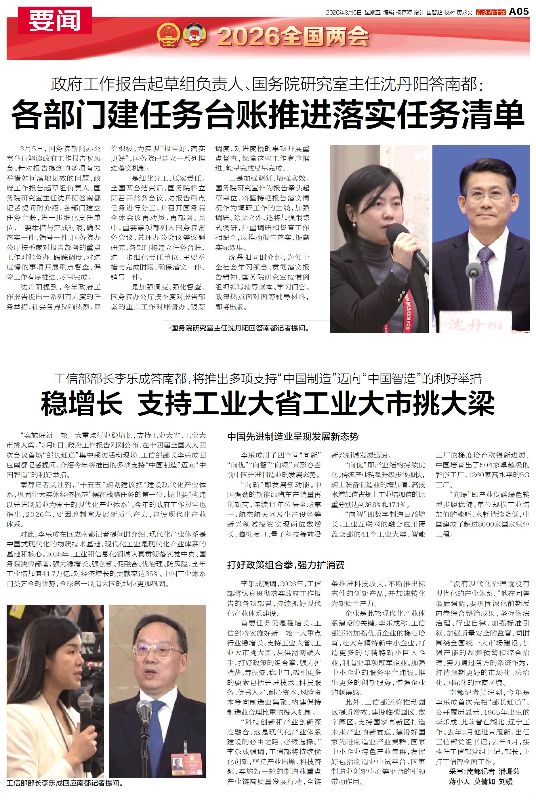 3月5日,政府工作报告刚刚公布,在十四届全国人大四次会议首场“部长通道”集中采访活动现场,工信部部长李乐成回应南都记者提问,介绍今年将推出的多项支持“中国制造”迈向“中国智造”的利好举措。
