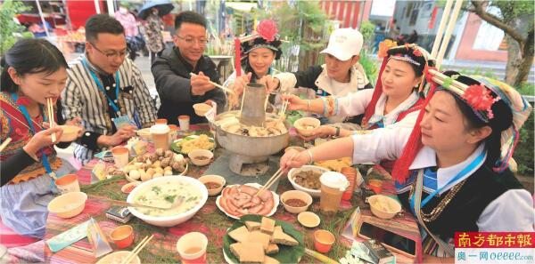 去年“五一”期间,在云南省怒江傈僳族自治州贡山县丙中洛镇,游客和当地各族同胞一起品尝美食。 新华社发