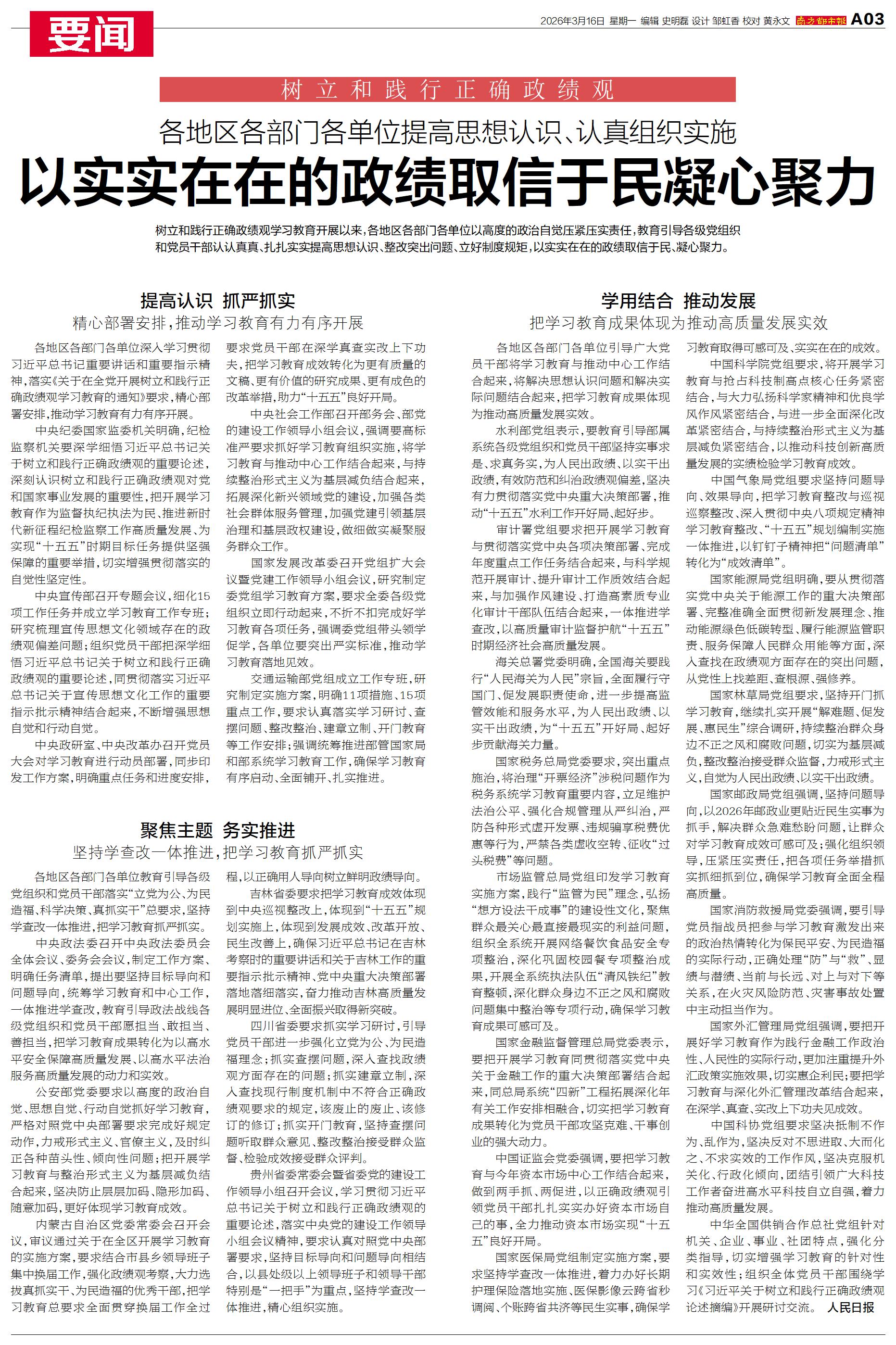 树立和践行正确政绩观学习教育开展以来,各地区各部门各单位以高度的政治自觉压紧压实责任,教育引导各级党组织和党员干部认认真真、扎扎实实提高思想认识、整改突出问题、立好制度规矩,以实实在在的政绩取信于民、