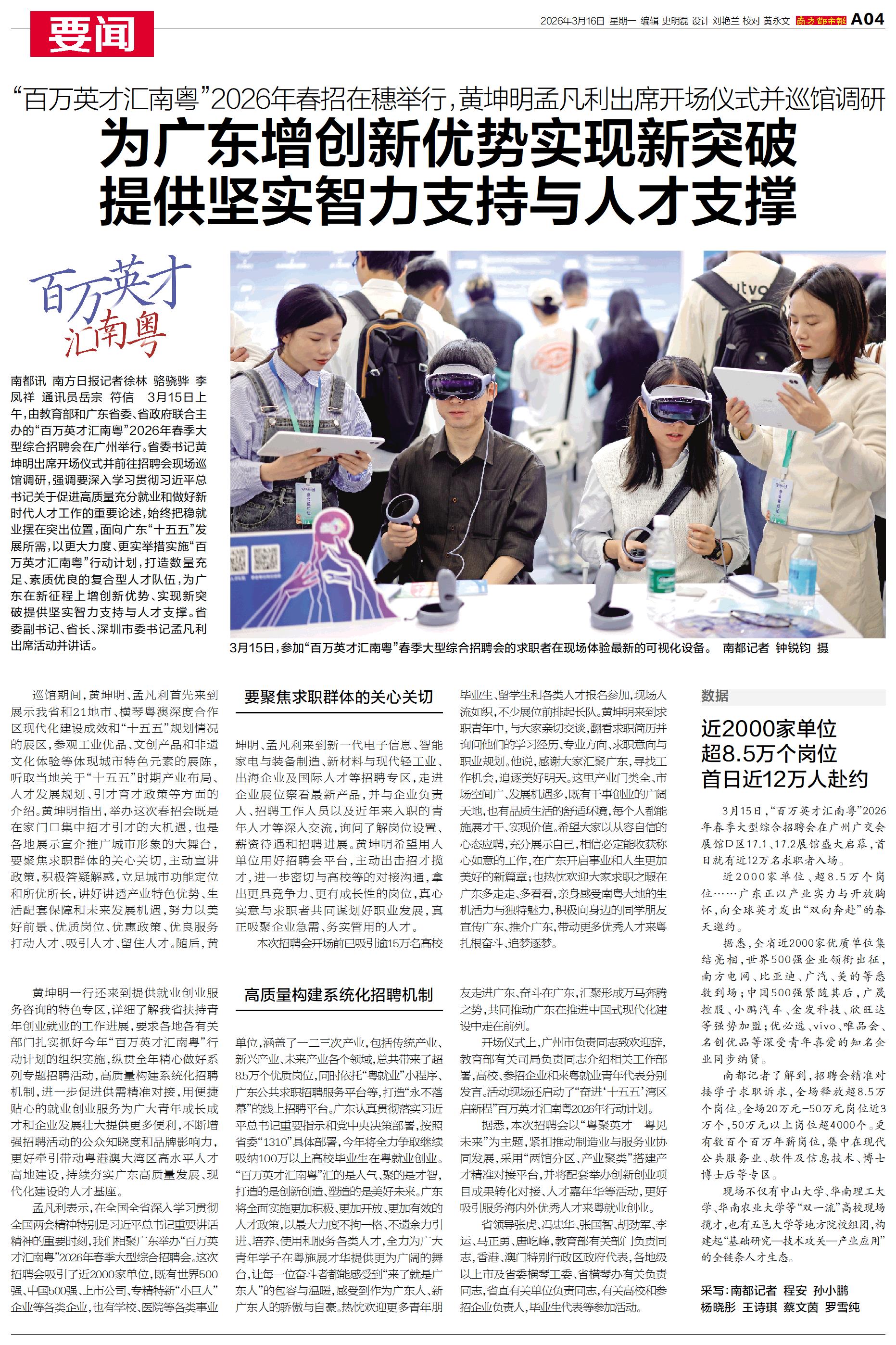3月15日上午,由教育部和广东省委、省政府联合主办的“百万英才汇南粤”2026年春季大型综合招聘会在广州举行。