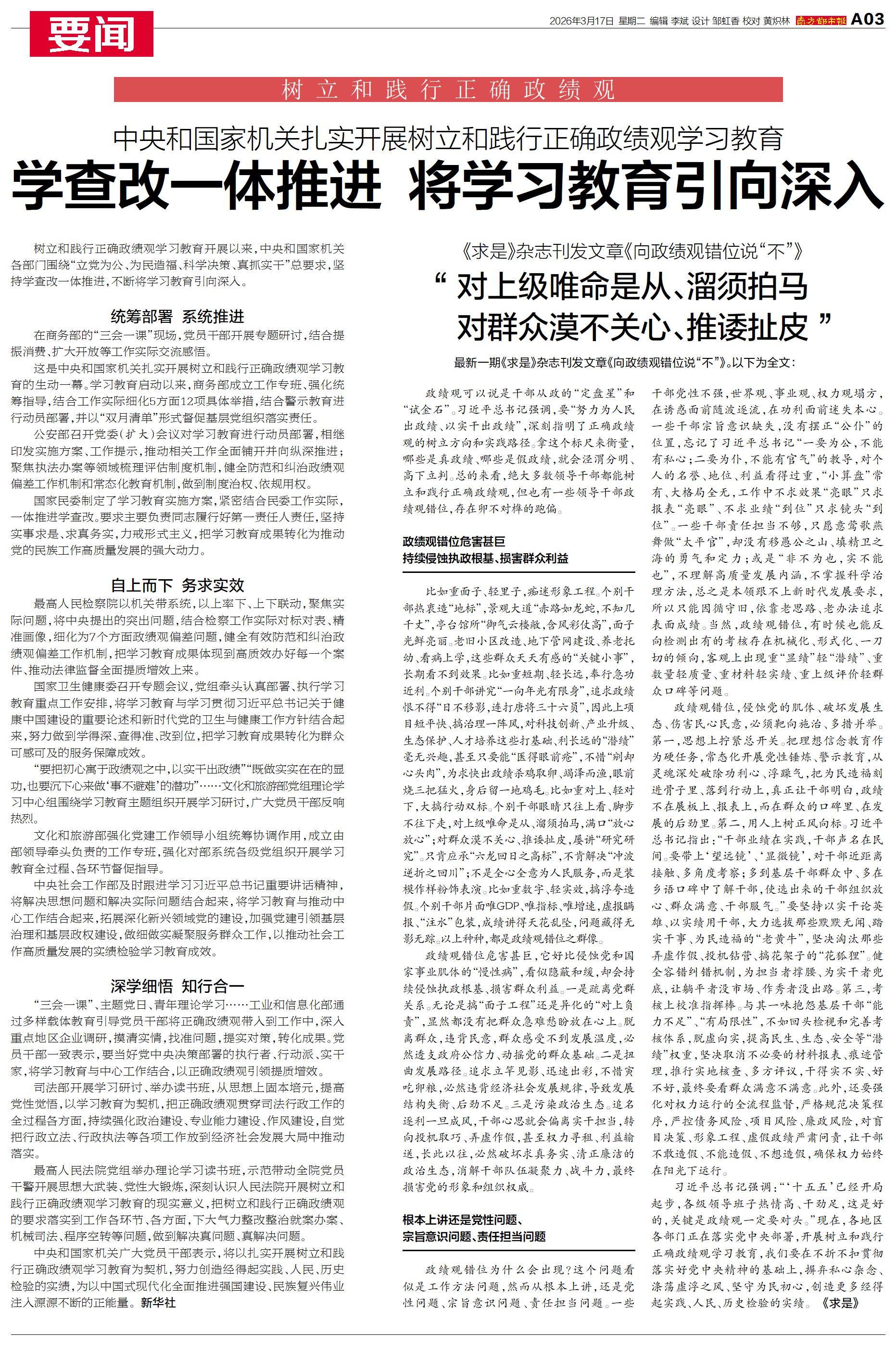 树立和践行正确政绩观学习教育开展以来,中央和国家机关各部门围绕“立党为公、为民造福、科学决策、真抓实干”总要求,坚持学查改一体推进,不断将学习教育引向深入。