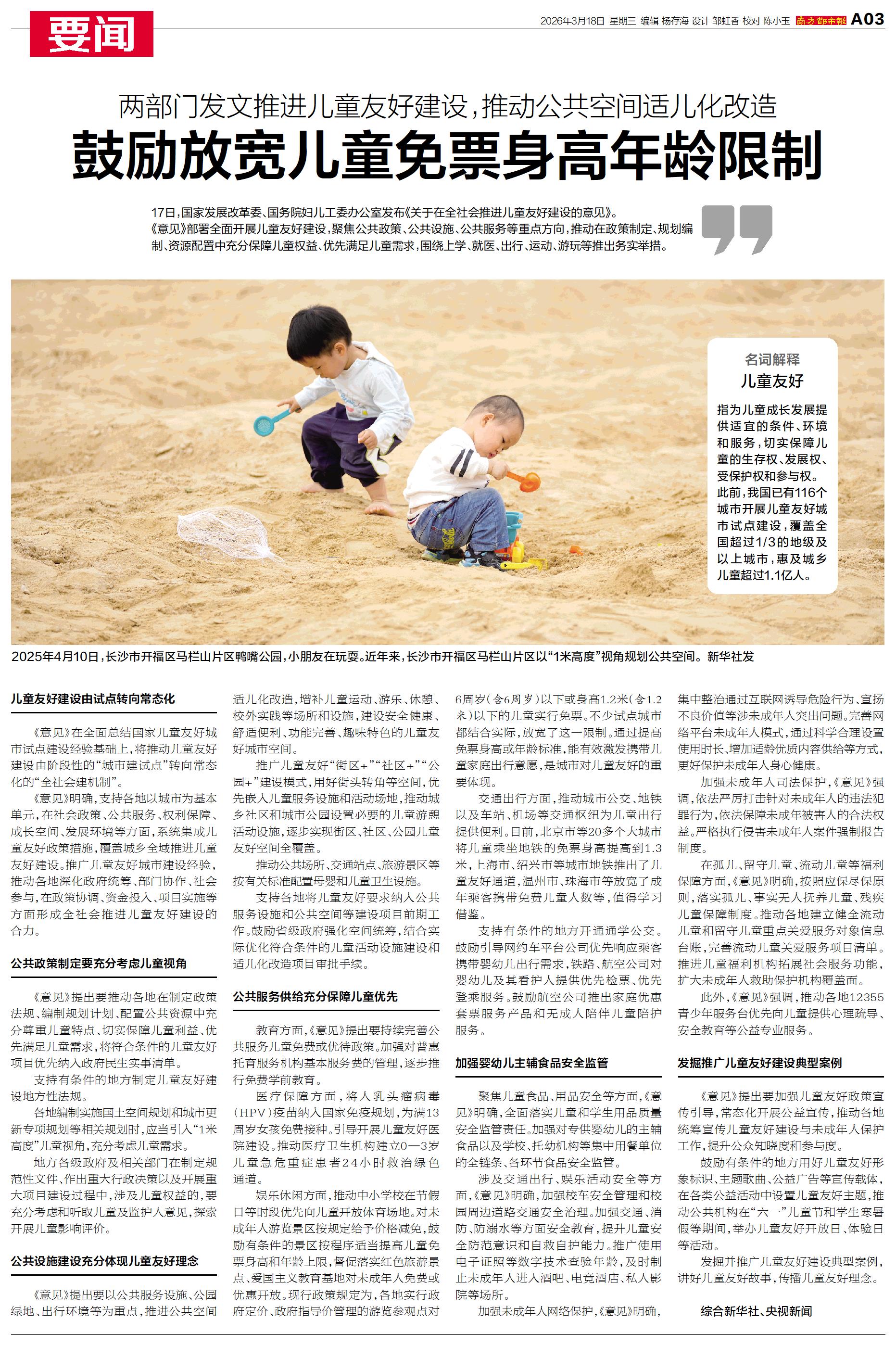 17日,国家发展改革委、国务院妇儿工委办公室发布《关于在全社会推进儿童友好建设的意见》。