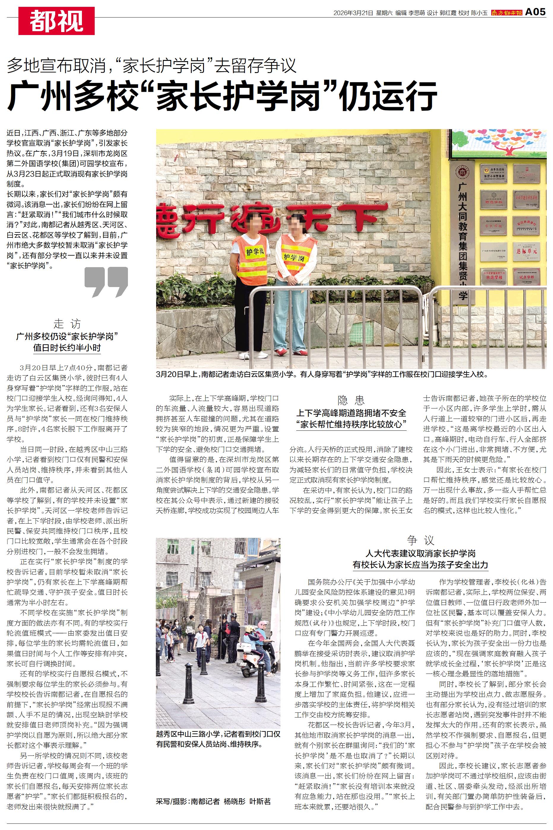 近日,江西、广西、浙江、广东等多地部分学校官宣取消“家长护学岗”,引发家长热议。