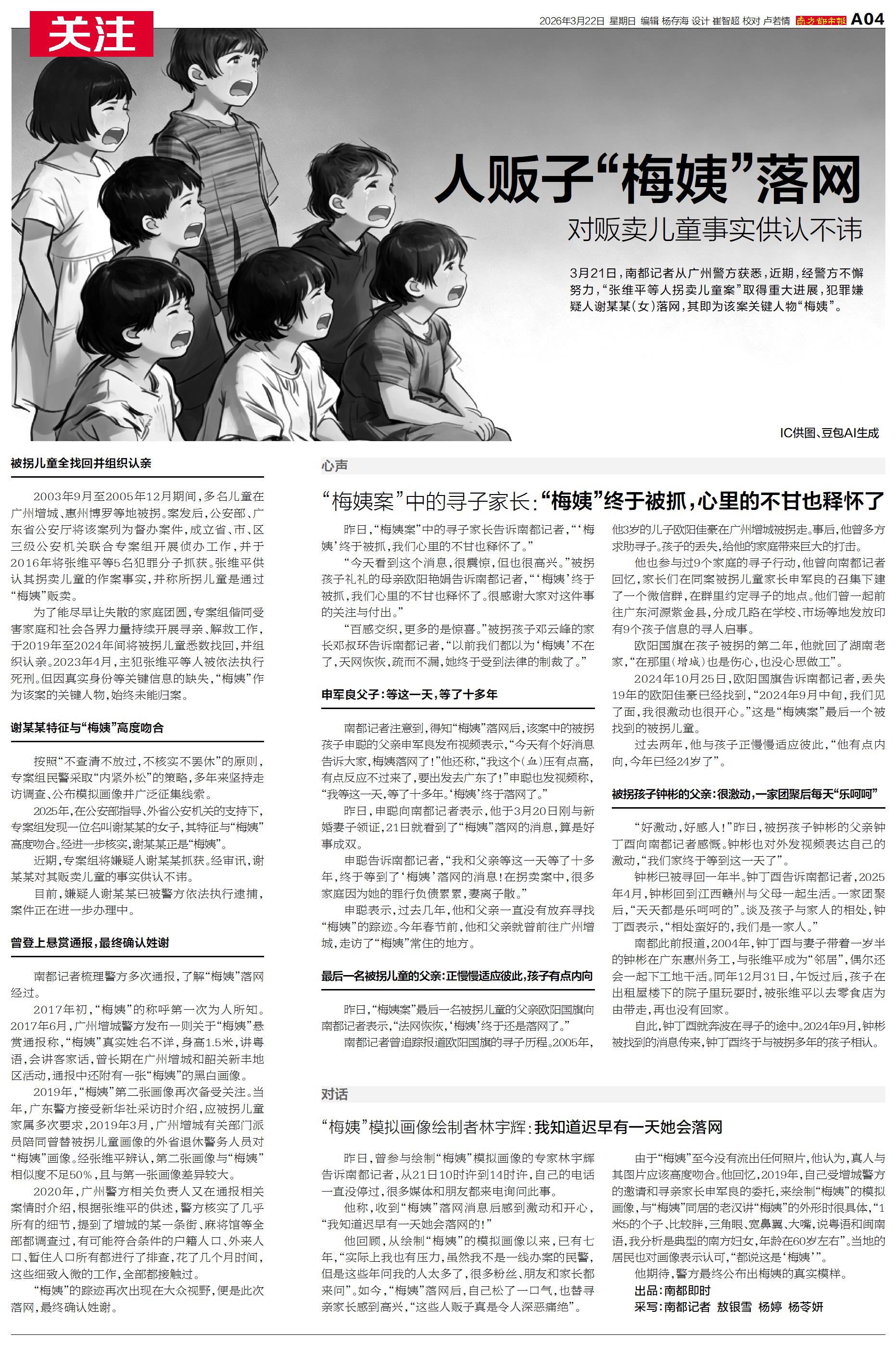 3月21日,南都记者从广州警方获悉,近期,经警方不懈努力,“张维平等人拐卖儿童案”取得重大进展,犯罪嫌疑人谢某某(女)落网,其即为该案关键人物“梅姨”。