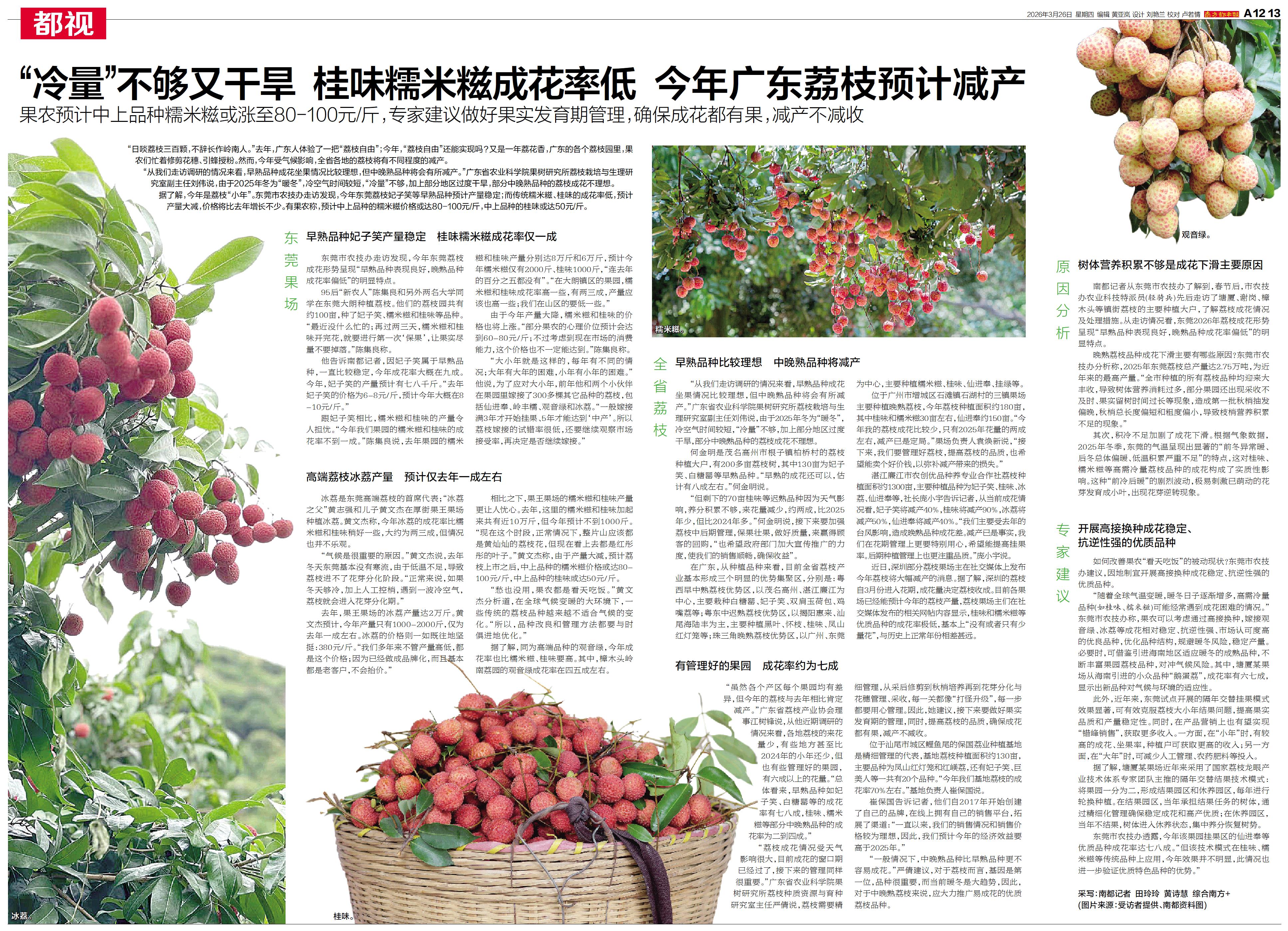 “但剩下的70亩桂味等迟熟品种因为天气影响,养分积累不够,来花量减少,约两成,比2025年少,但比2024年多。”何金明说,接下来要加强荔枝中后期管理,保果壮果,做好质量,来赢得顾客的回购,“也希望政府部门加大宣传推广的力度,使我们的销售顺畅,确保收益”。