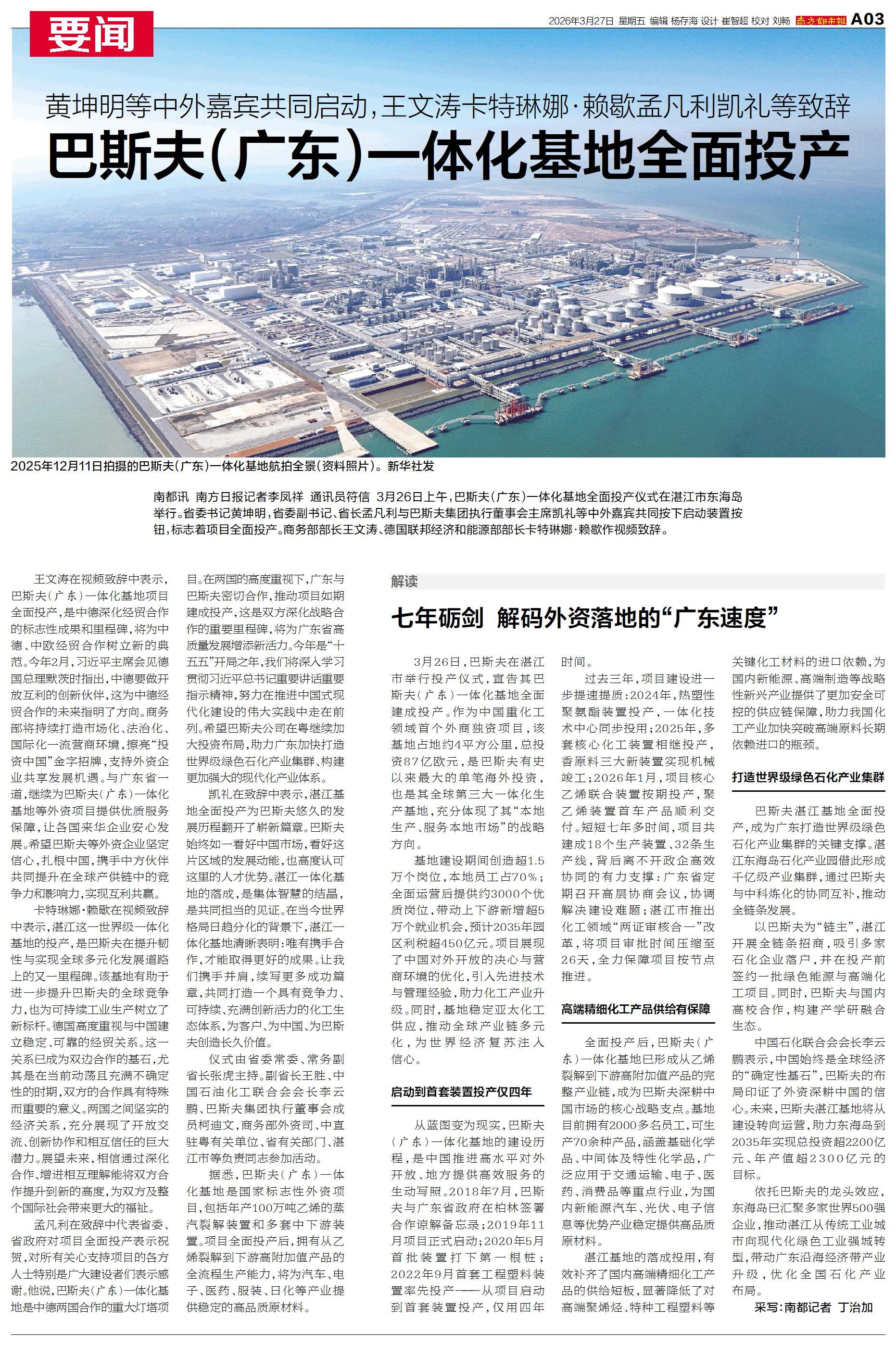 王文涛在视频致辞中表示,巴斯夫(广东)一体化基地项目全面投产,是中德深化经贸合作的标志性成果和里程碑,将为中德、中欧经贸合作树立新的典范。今年2月,习近平主席会见德国总理默茨时指出,中德要做开放互利的创新伙伴,这为中德经贸合作的未来指明了方向。商务部将持续打造市场化、法治化、国际化一流营商环境,擦亮“投资中国”金字招牌,支持外资企业共享发展机遇。与广东省一道,继续为巴斯夫(广东)一体化基地等外资项目提供优质服务保障,让各国来华企业安心发展。希望巴斯夫等外资企业坚定信心,扎根中国,携手中方伙伴共同提升在全球产供链中的竞争力和影响力,实现互利共赢。