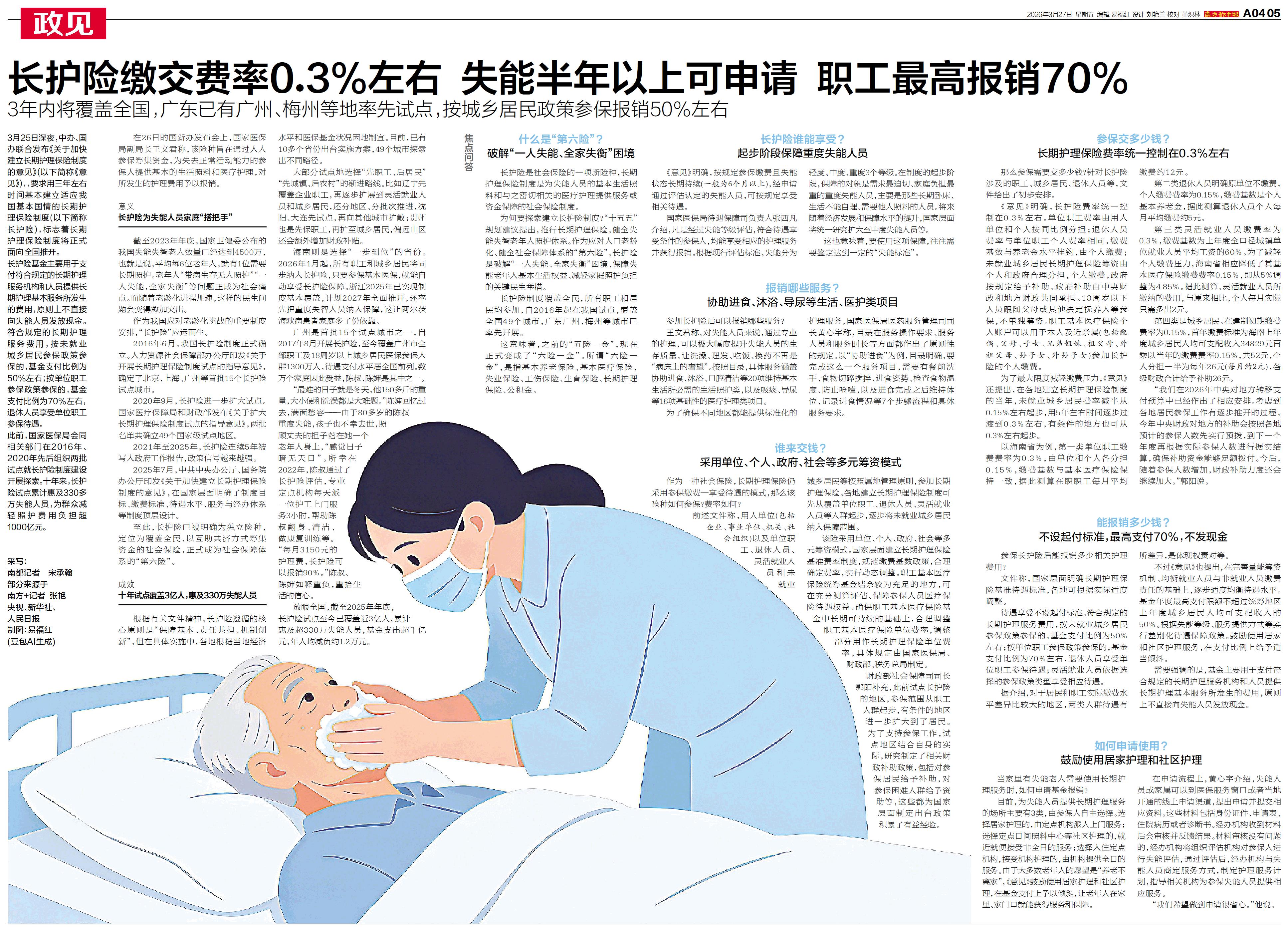 长护险缴交费率0.3%左右 失能半年以上可申请 职工最高报销70%