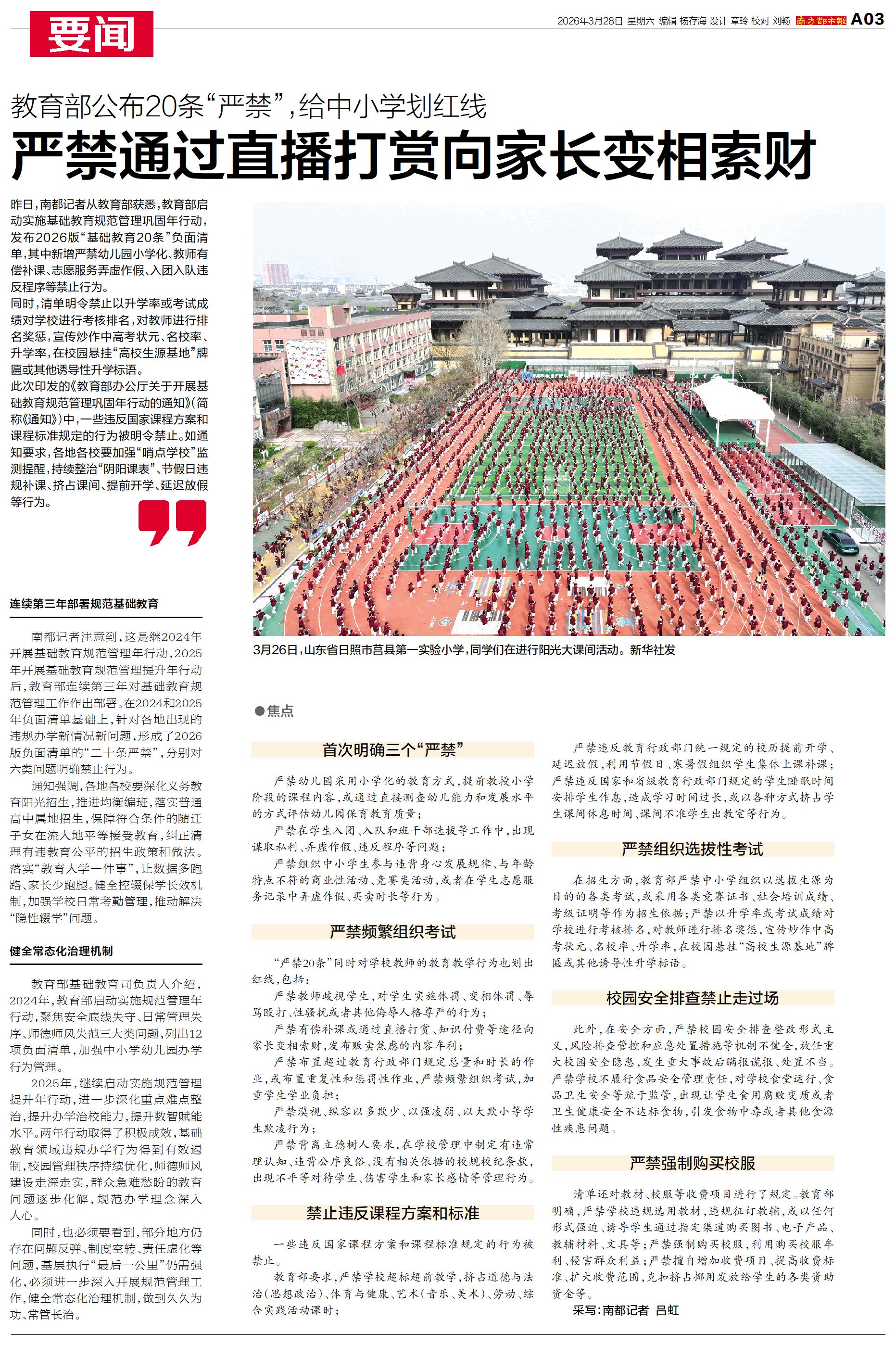 南都记者从教育部获悉,教育部启动实施基础教育规范管理巩固年行动,发布2026版“基础教育20条”负面清单。