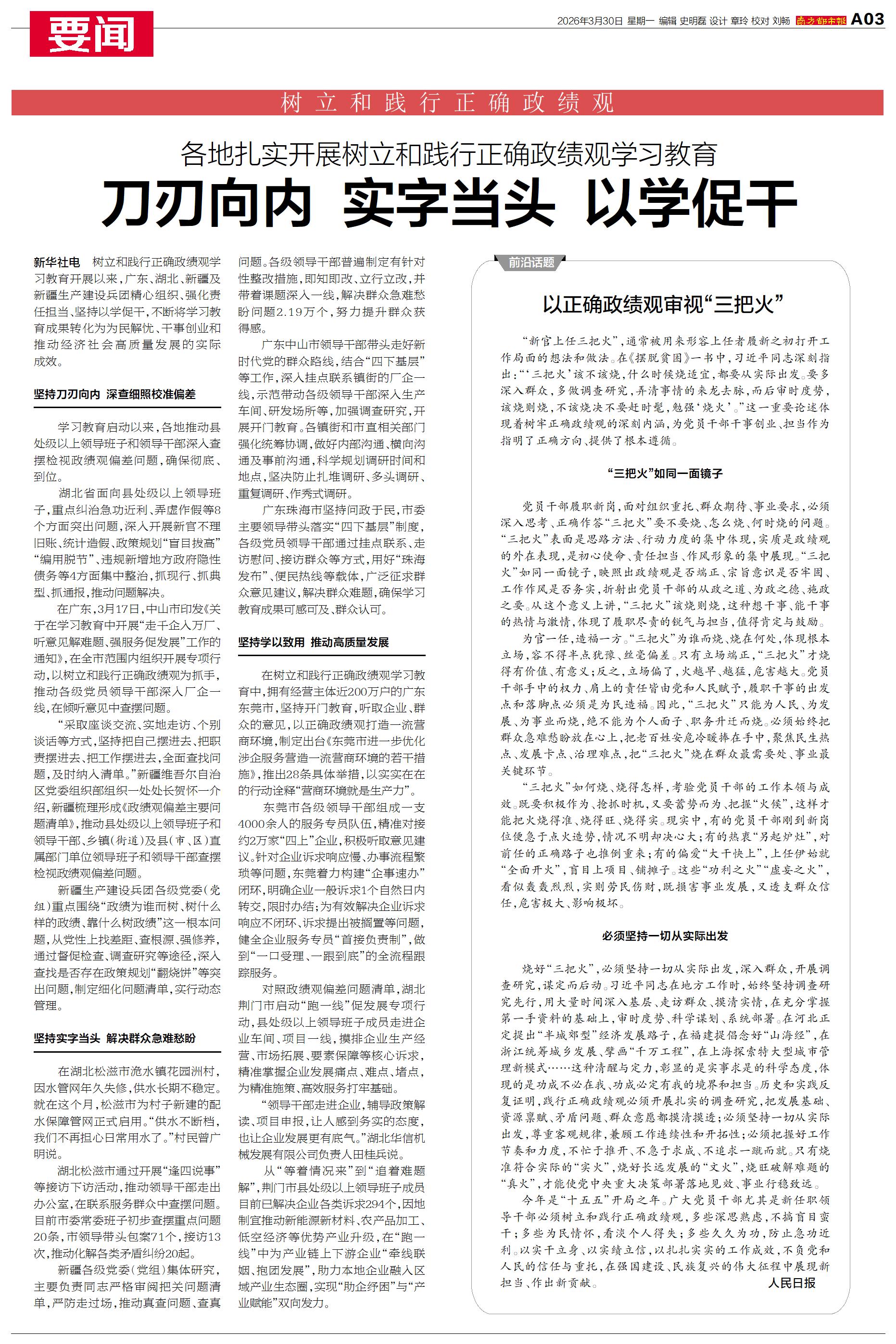 树立和践行正确政绩观学习教育开展以来,广东、湖北、新疆及新疆生产建设兵团精心组织、强化责任担当、坚持以学促干,不断将学习教育成果转化为为民解忧、干事创业和推动经济社会高质量发展的实际成效。