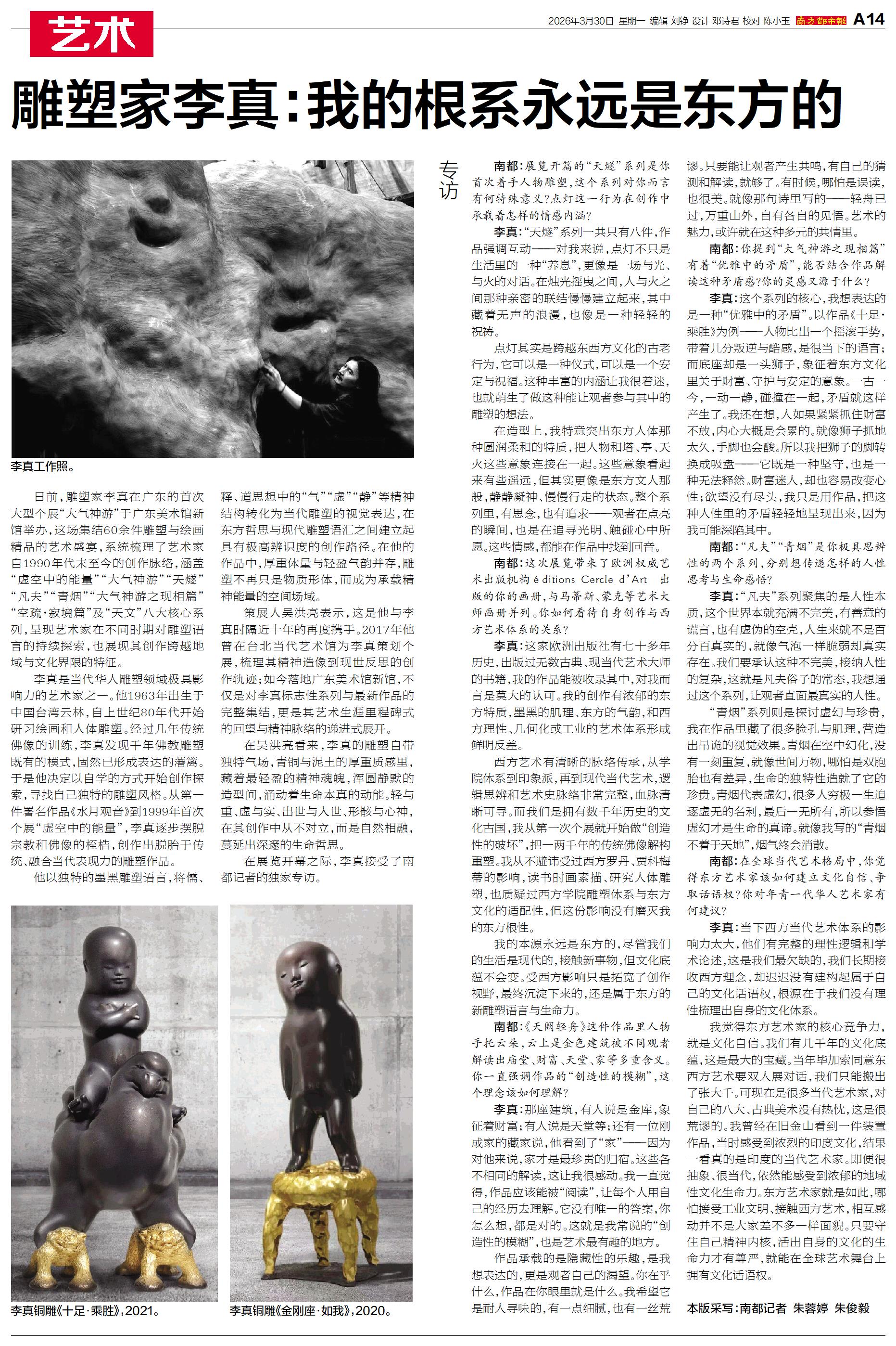 日前,雕塑家李真在广东的首次大型个展“大气神游”于广东美术馆新馆举办。