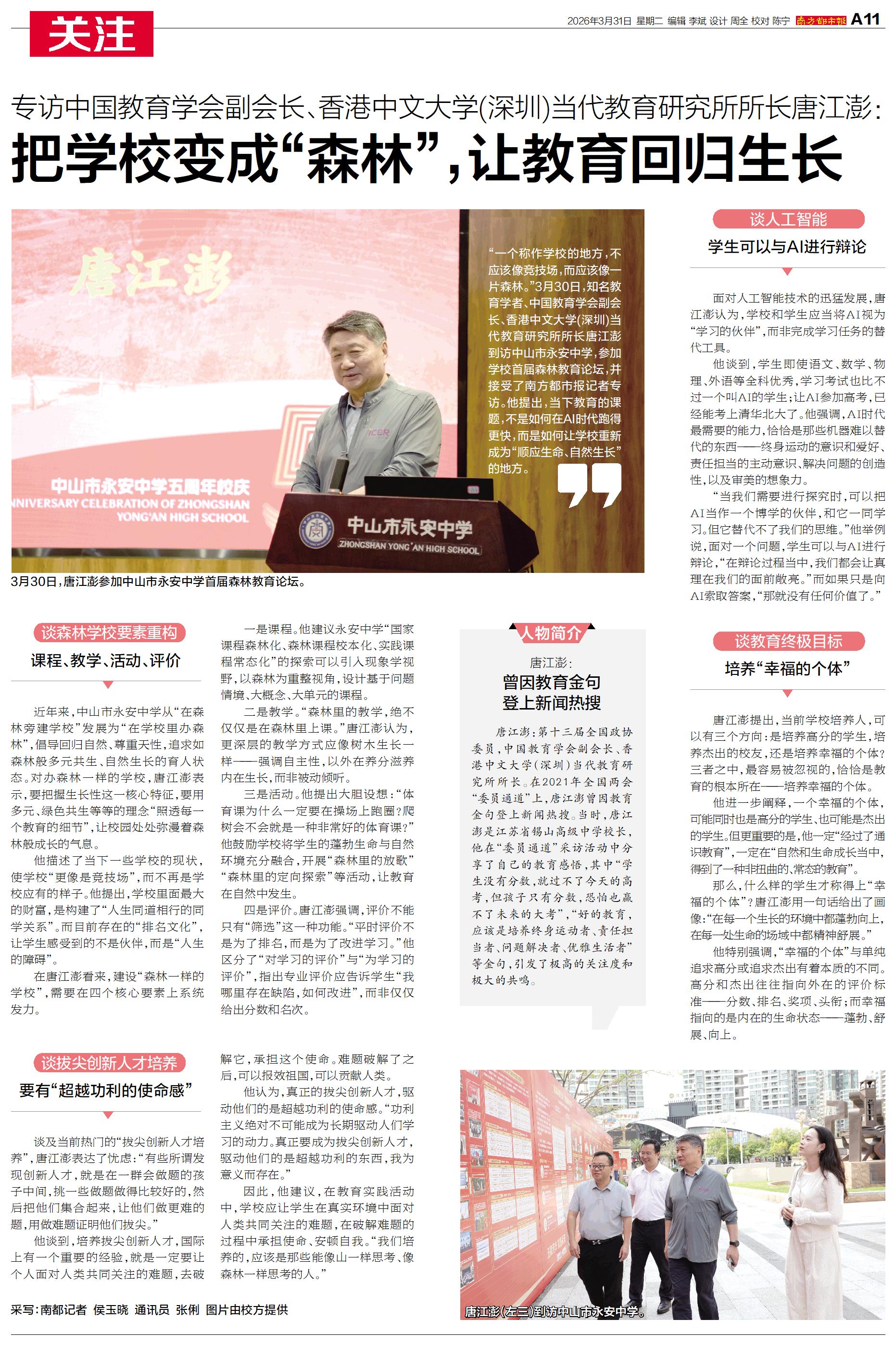 3月30日,知名教育学者、中国教育学会副会长、香港中文大学(深圳)当代教育研究所所长唐江澎到访中山市永安中学,参加学校首届森林教育论坛,并接受了南方都市报记者专访。