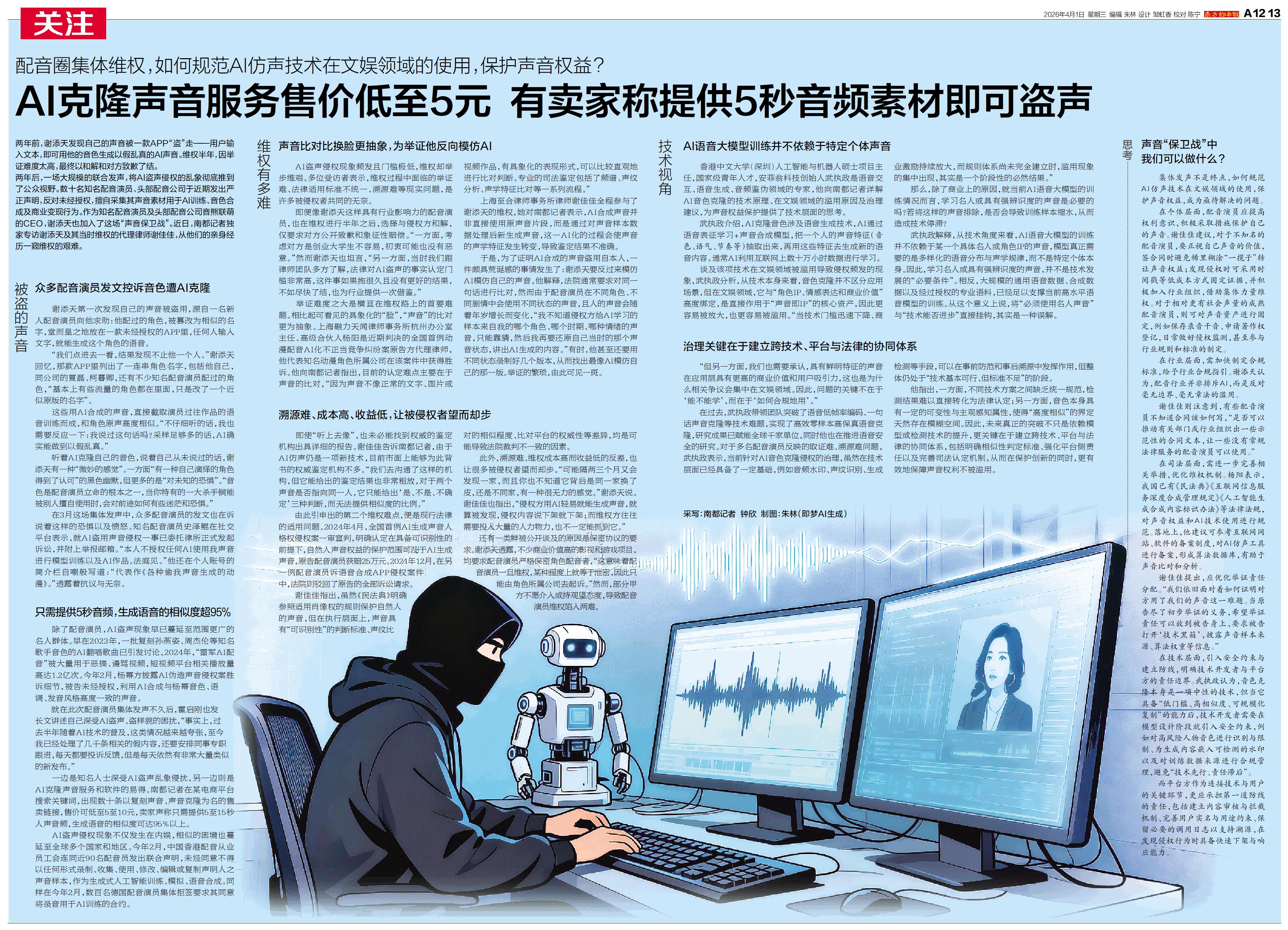 两年前,谢添天发现自己的声音被一款APP“盗”走——用户输入文本,即可用他的音色生成以假乱真的AI声音。维权半年,因举证难度太高,最终以和解和对方致歉了结。