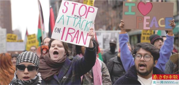 人们在美国纽约等地参加集会游行,抗议美国和以色列对伊朗发动军事打击。新华社发