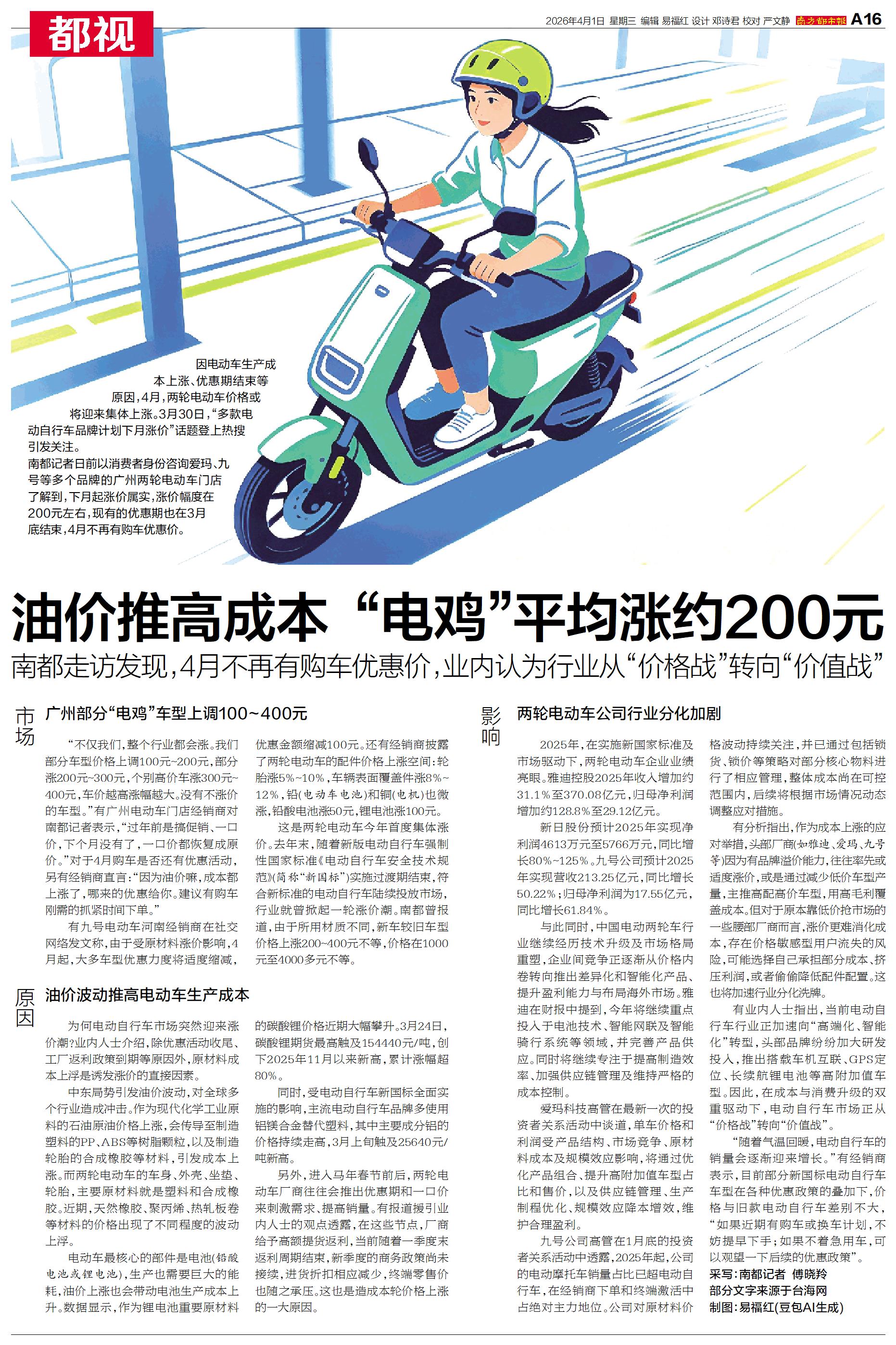 因电动车生产成本上涨、优惠期结束等原因,4月,两轮电动车价格或将迎来集体上涨。3月30日,“多款电动自行车品牌计划下月涨价”话题登上热搜引发关注。