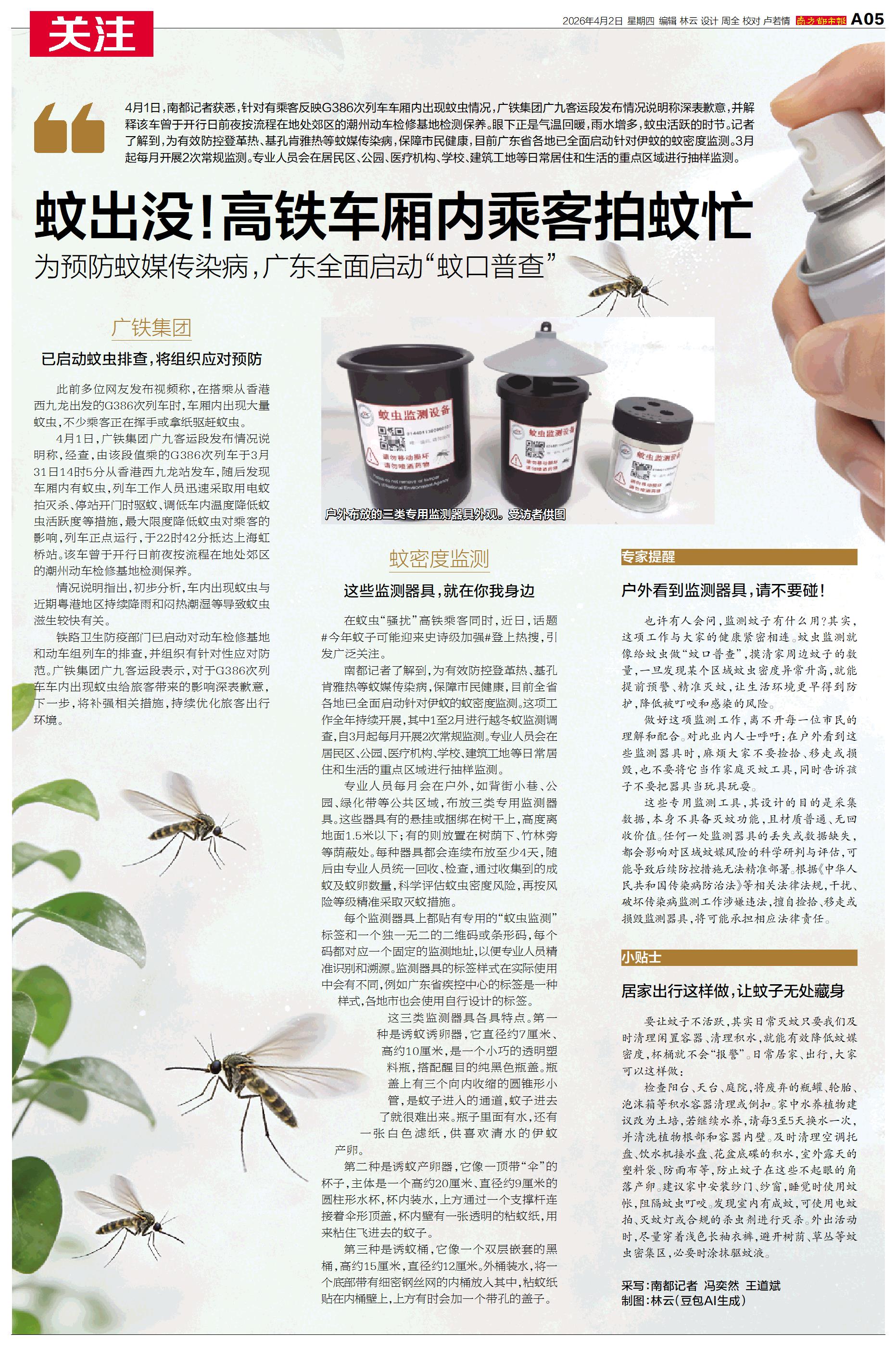 4月1日,南都记者获悉,针对有乘客反映G386次列车车厢内出现蚊虫情况,广铁集团广九客运段发布情况说明称深表歉意,并解释该车曾于开行日前夜按流程在地处郊区的潮州动车检修基地检测保养。