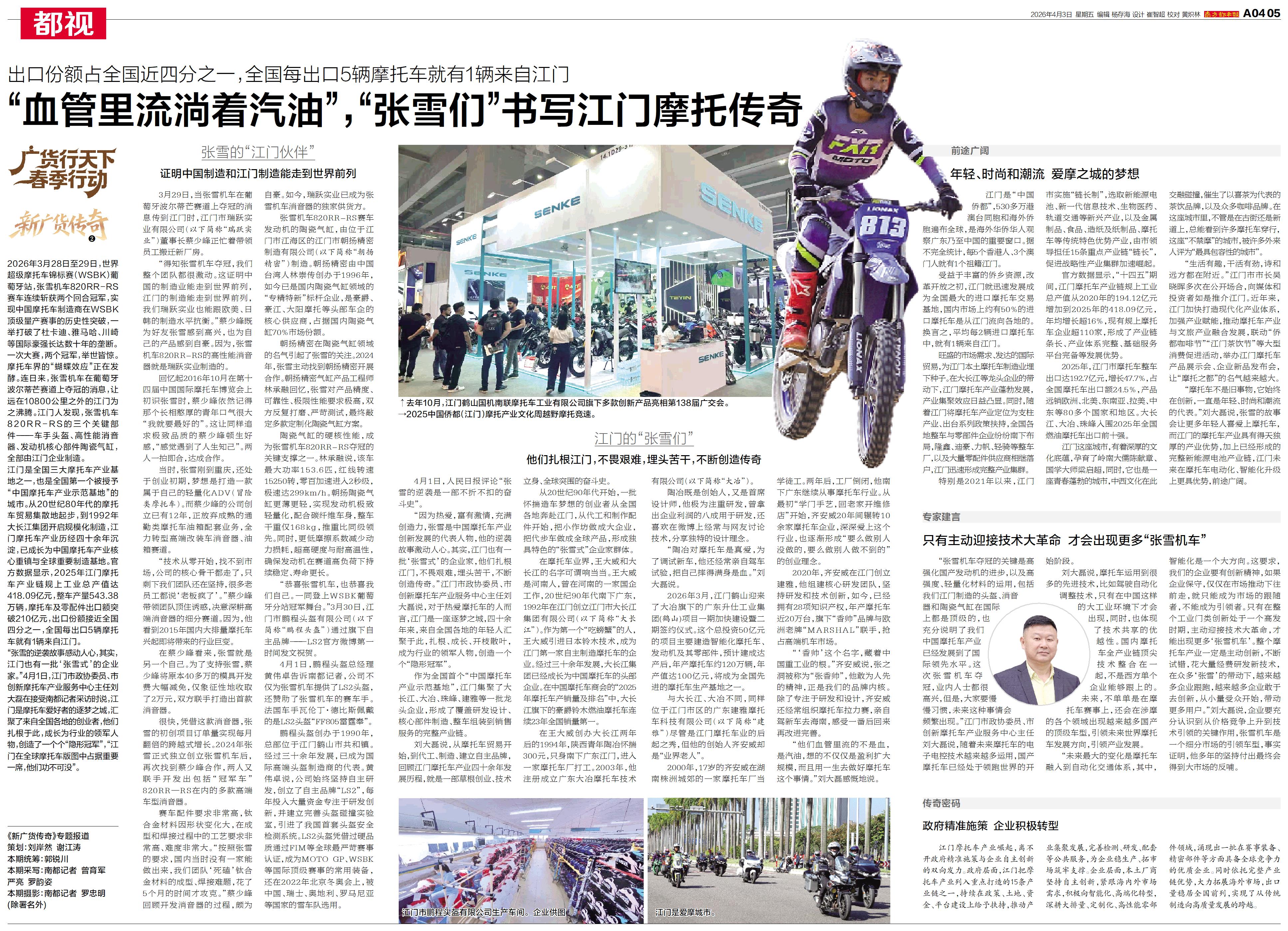 “因为热爱,富有激情,充满创造力,张雪是中国摩托车产业创新发展的代表人物,他的逆袭故事激动人心。其实,江门也有一批‘张雪式’的企业家,他们扎根江门,不畏艰难,埋头苦干,不断创造传奇。”江门市政协委员、市创新摩托车产业服务中心主任刘大磊说,对于热爱摩托车的人而言,江门是一座逐梦之城,四十余年来,来自全国各地的年轻人汇聚于此,扎根、成长、开枝散叶,成为行业的领军人物,创造一个个“隐形冠军”。