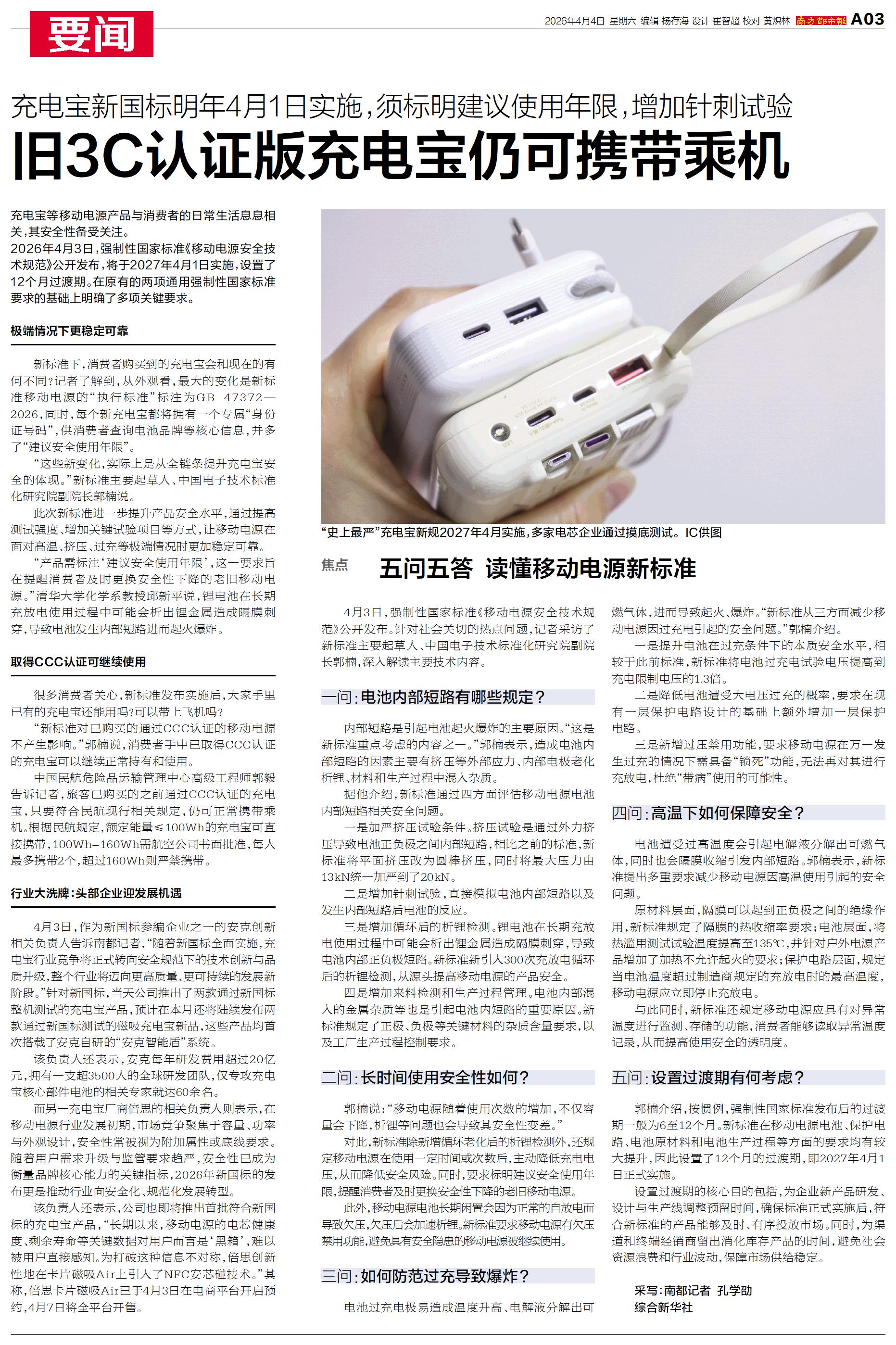 4月3日,强制性国家标准《移动电源安全技术规范》公开发布。针对社会关切的热点问题,记者采访了新标准主要起草人、中国电子技术标准化研究院副院长郭楠,深入解读主要技术内容。