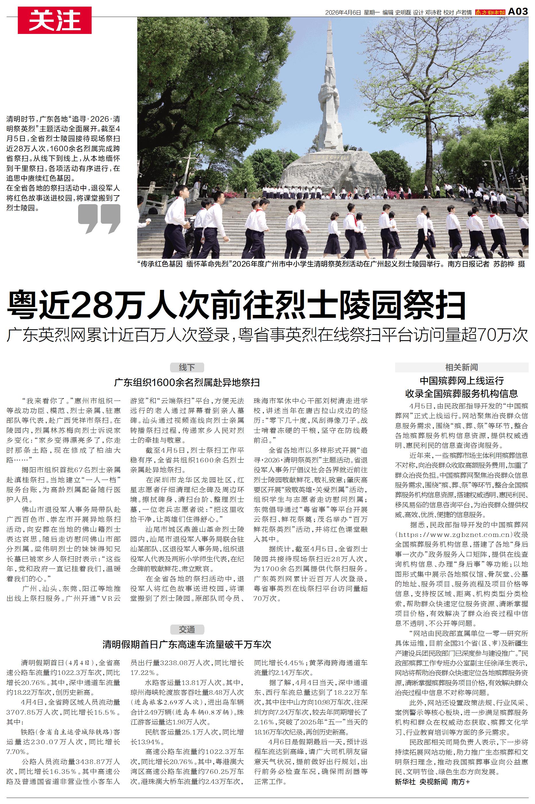 据统计,截至4月5日,全省烈士陵园共接待现场祭扫近28万人次,为1700余名烈属提供代祭扫服务。广东英烈网累计近百万人次登录,粤省事英烈在线祭扫平台访问量超70万次。
