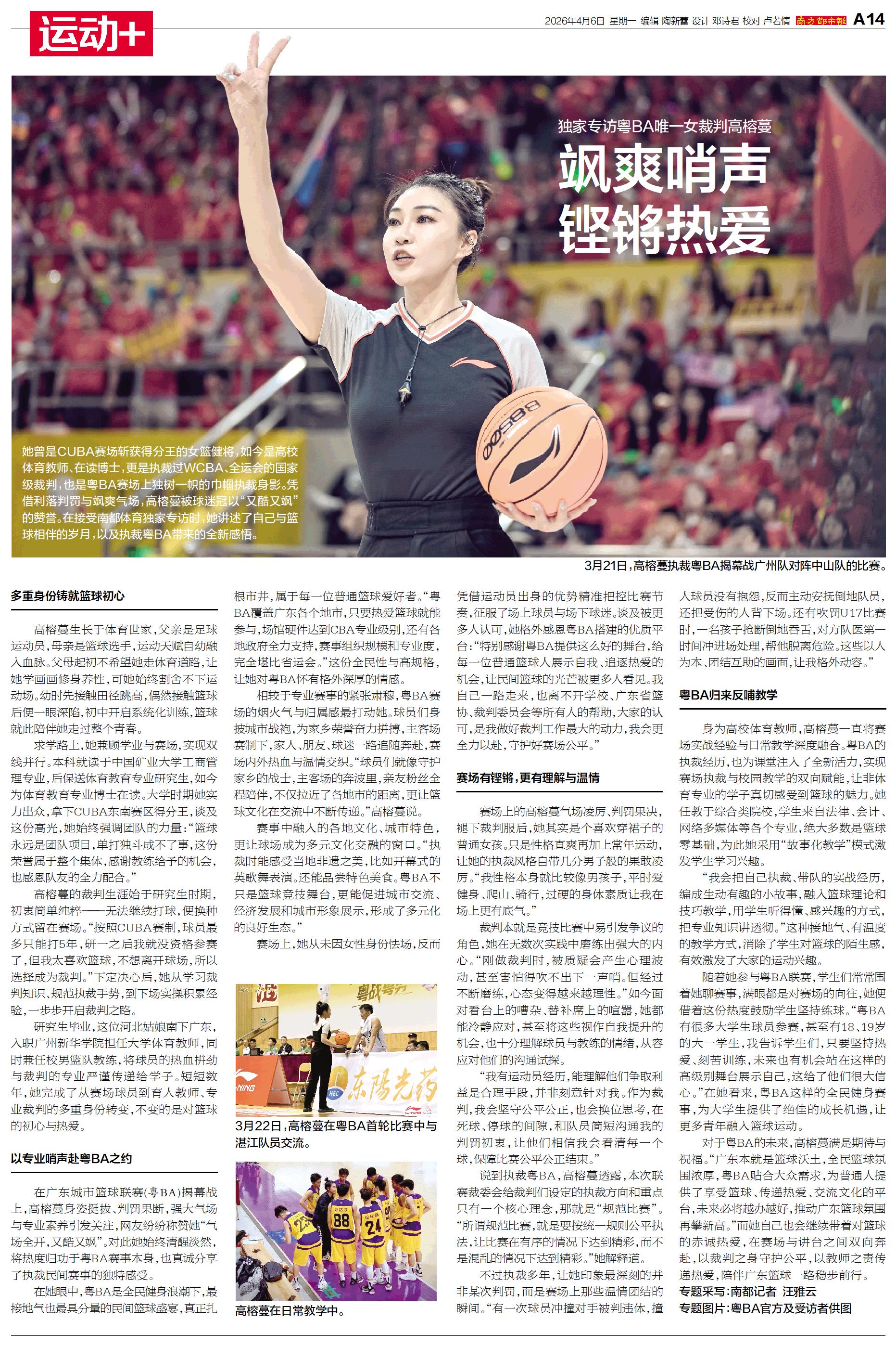 她曾是CUBA赛场斩获得分王的女篮健将,如今是高校体育教师、在读博士,更是执裁过WCBA、全运会的国家级裁判,也是粤BA赛场上独树一帜的巾帼执裁身影。