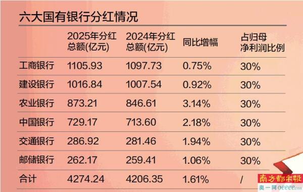 六大国有银行2025年全年合计分红再次超过4200亿元。近日,国有行纷纷披露2025年度利润分配方案。南都记者统计发现,算上此前已经派发的中期股息,2025年全年,国有行拟分红总额高达4274.24亿元,较2024年度增长1.61%。其中,工商银行和建设银行年度分红总额均超过千亿元。工商银行高管在业绩发布会上还表态称,如果资本市场确实有呼声在分红率方面做向上调整,该行一定会起到模范带头作用。