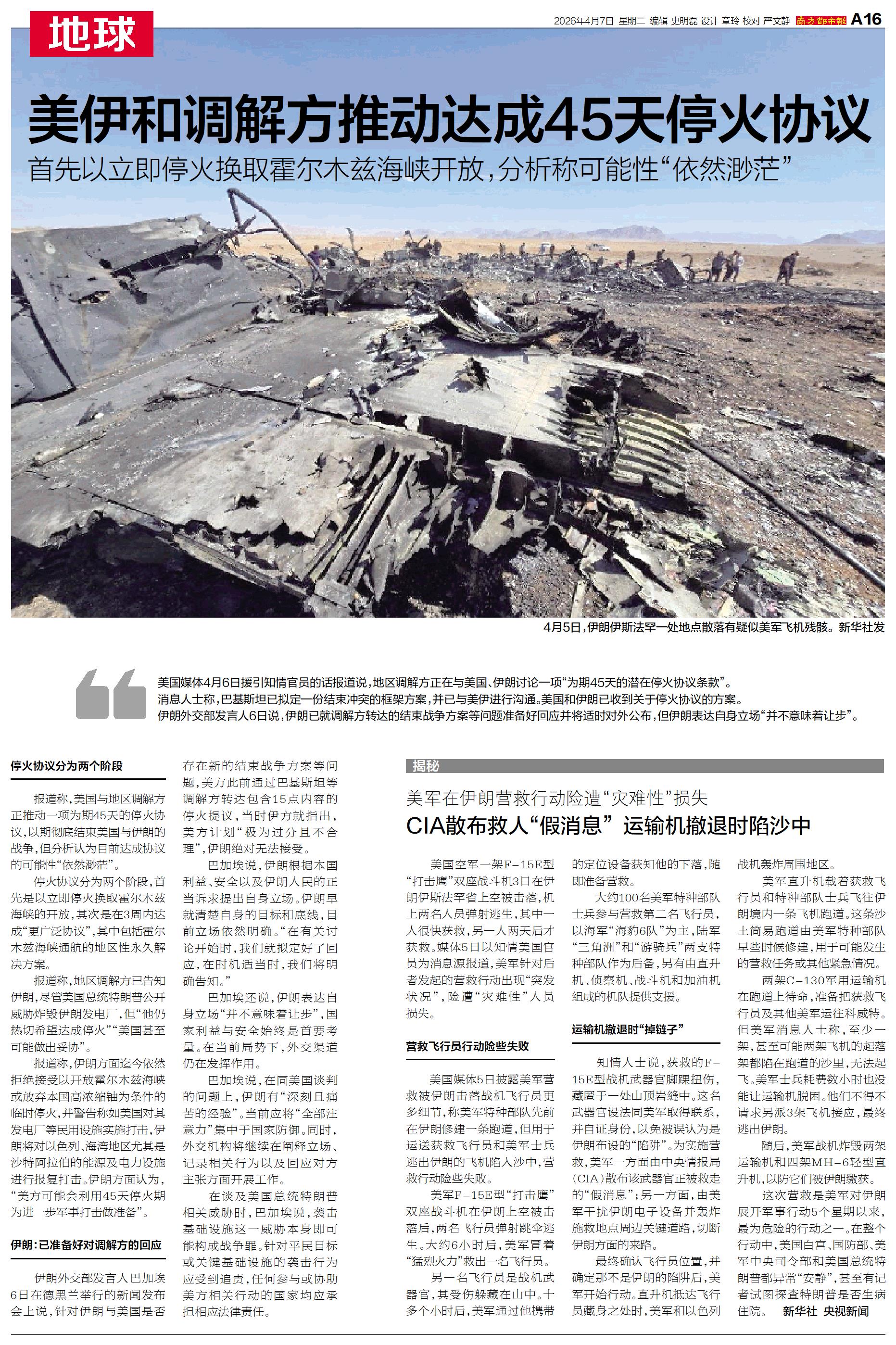 美国媒体4月6日援引知情官员的话报道说,地区调解方正在与美国、伊朗讨论一项“为期45天的潜在停火协议条款”。