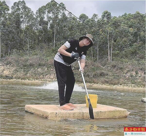 阳江队球员梁家俊打理虾塘。